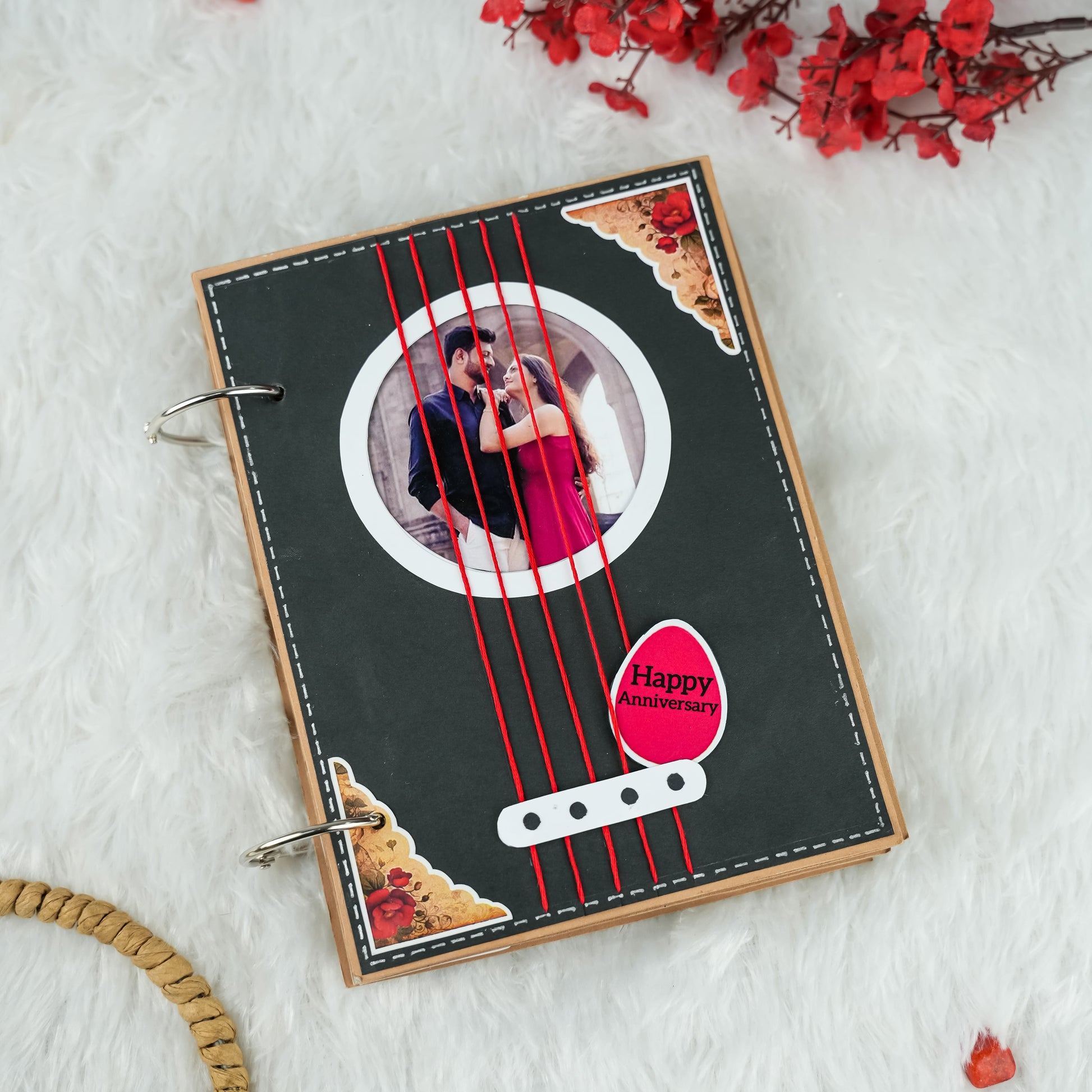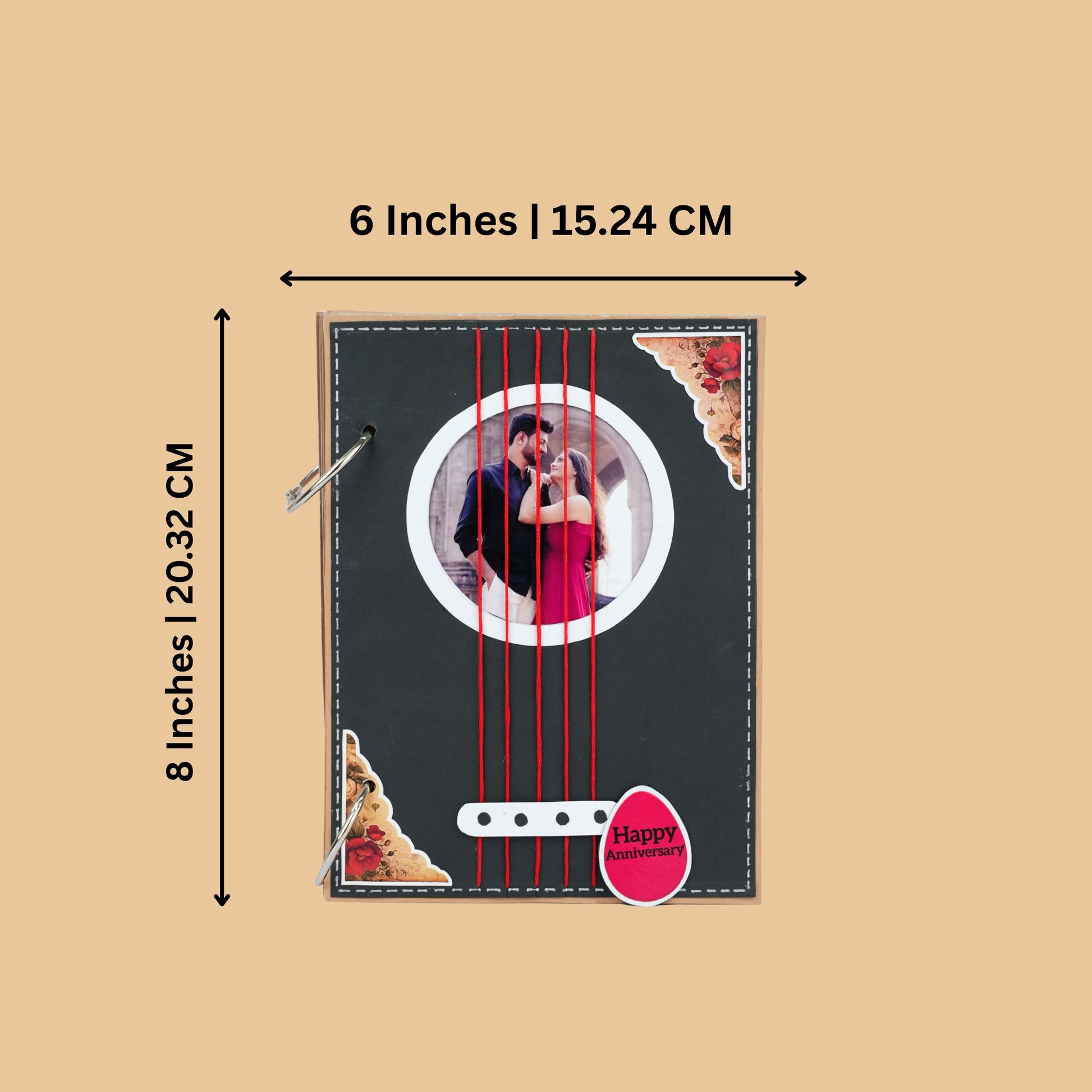 Hit the perfect note for their special day with this truly unique Guitar-Themed Handcrafted Album! Designed to resemble a stylish acoustic guitar, this 8x6 inch album features a striking black cover with decorative red strings and a personalized photo framed as the soundhole. The front also includes a plectrum-shaped "Happy Anniversary" message. Inside, you'll find 18 custom pages filled with beautiful and surprising "wow" elements, ready to hold up to 25 personalized pictures. It's a thoughtful and unforgettable keepsake, especially perfect for a anniversary or any celebration for a music enthusiast.