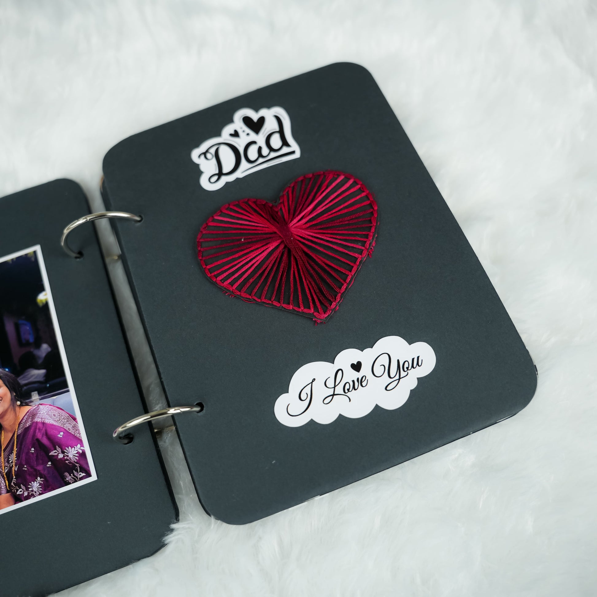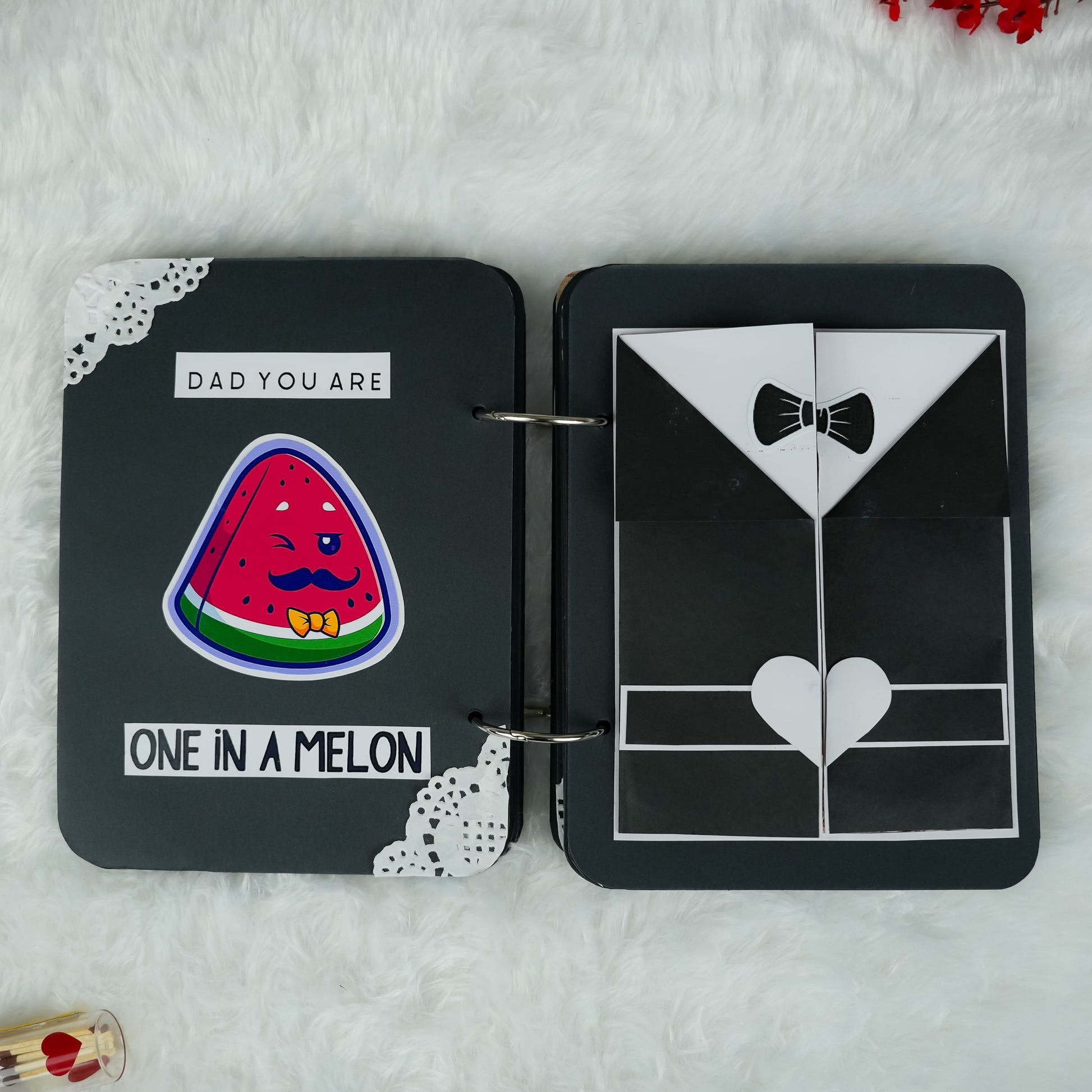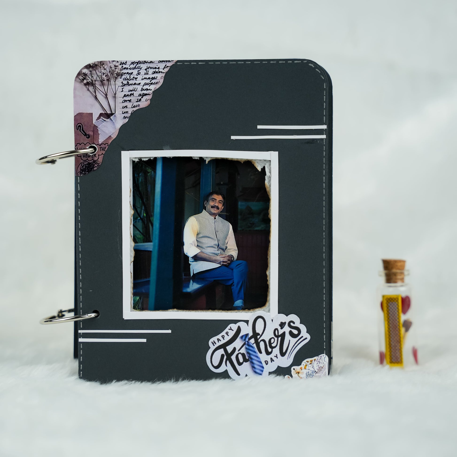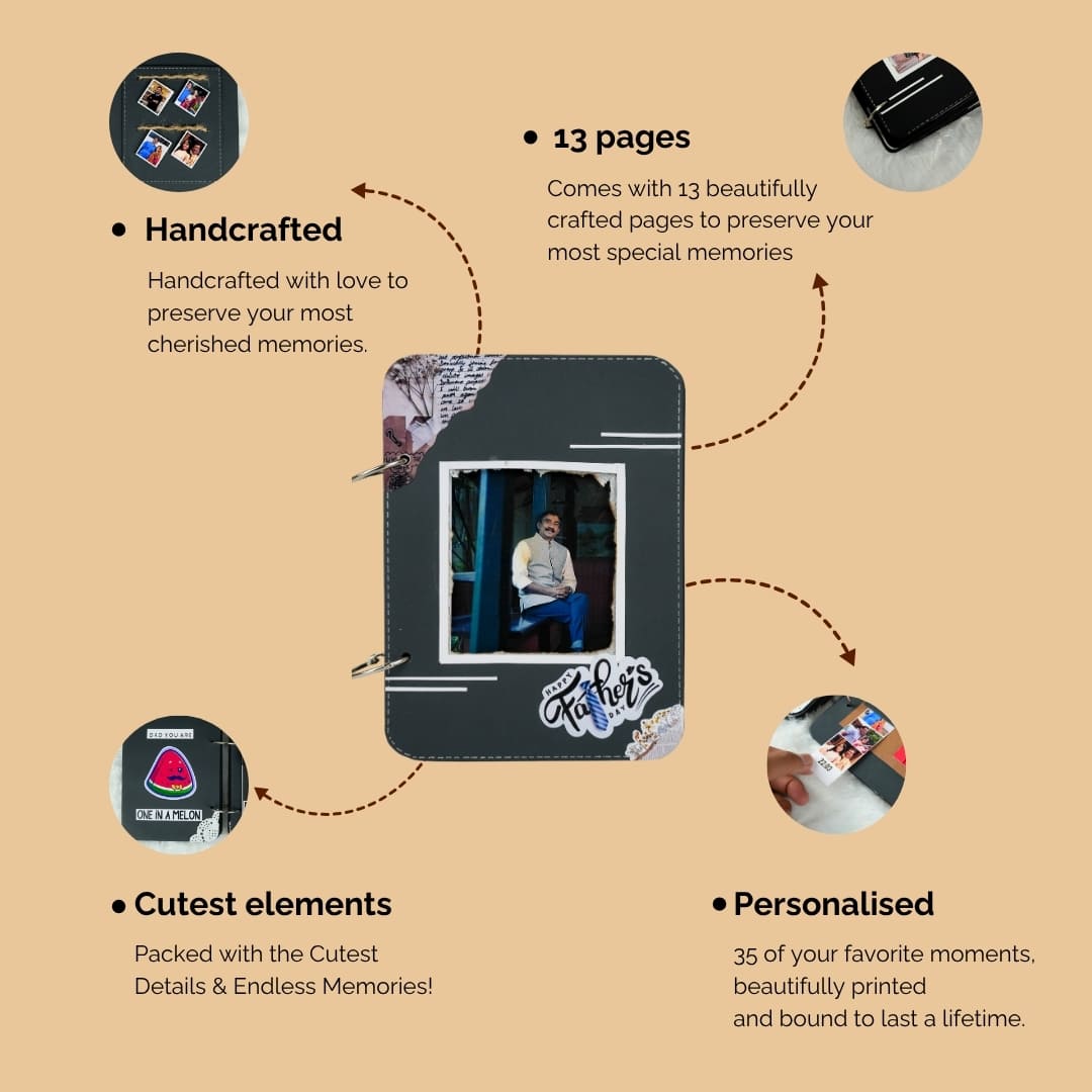 Surprise Dad this Father's Day with our magical "Fire Reveal" Album! This 8x6 inch album features a unique front page that, when lit, safely reveals a hidden image in a captivating glow. Inside, 12 thick black pages hold up to 35 personalized pictures and heartfelt messages. It has charming elements and matchsticks in a tiny bottle, it's an unforgettable and truly special gift for any dad.