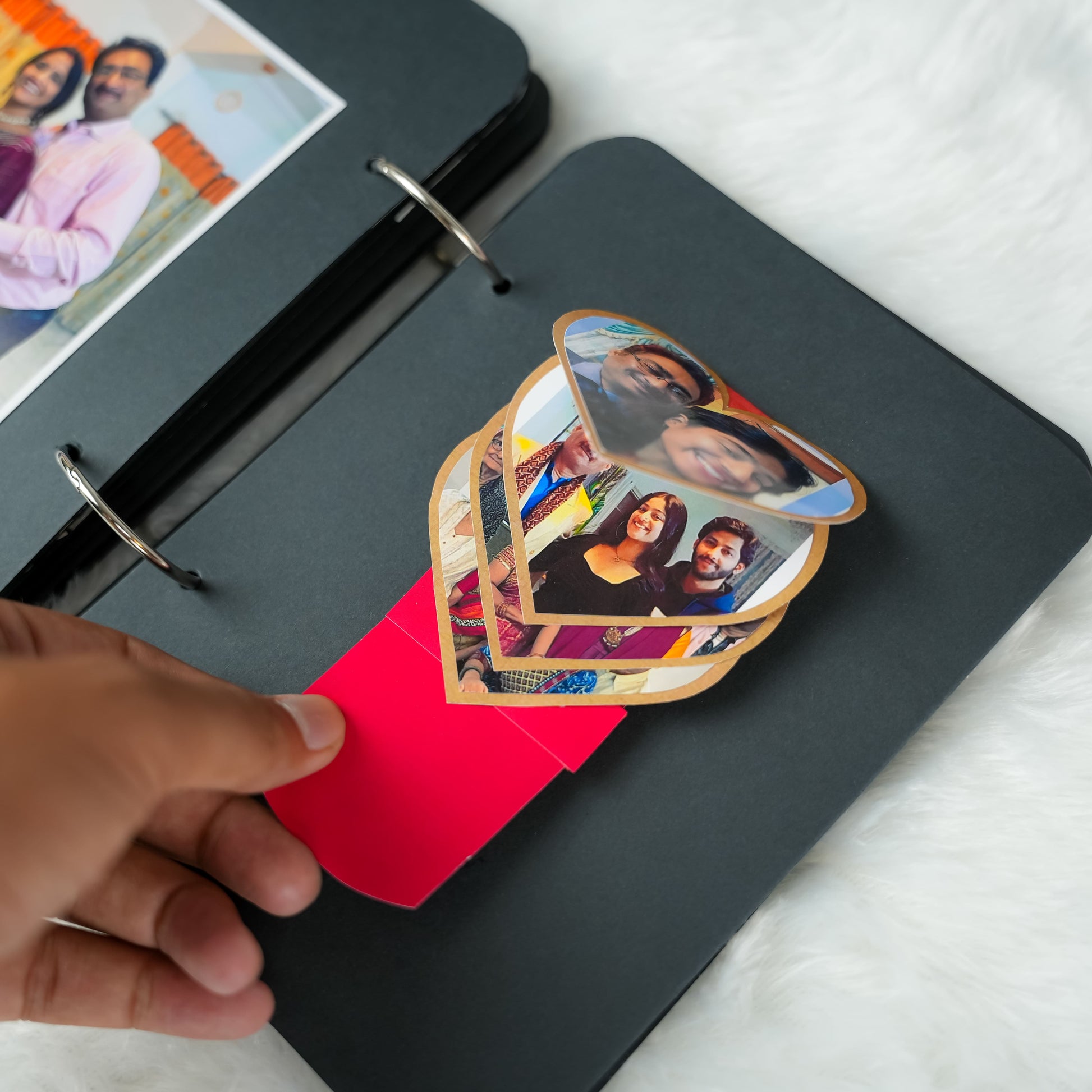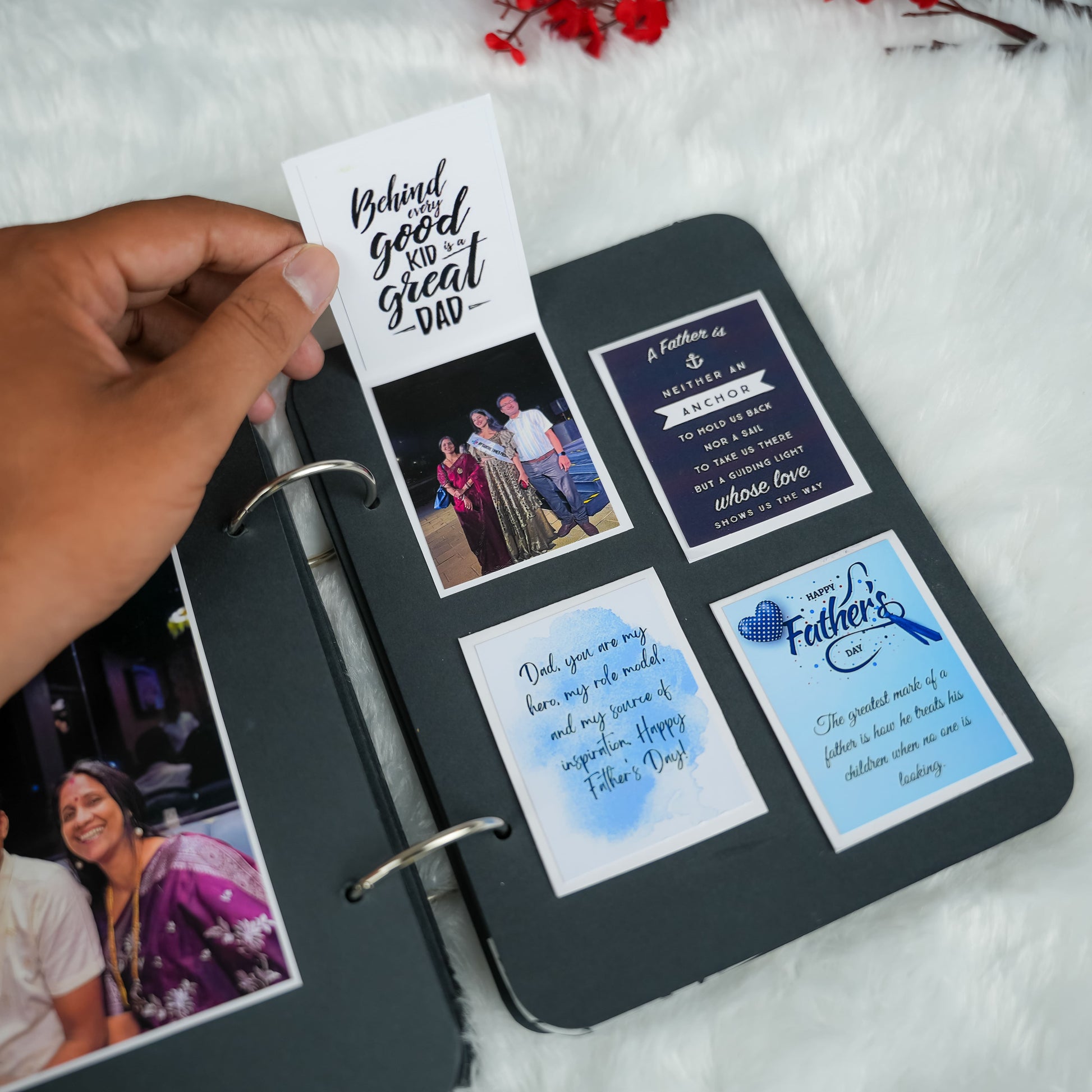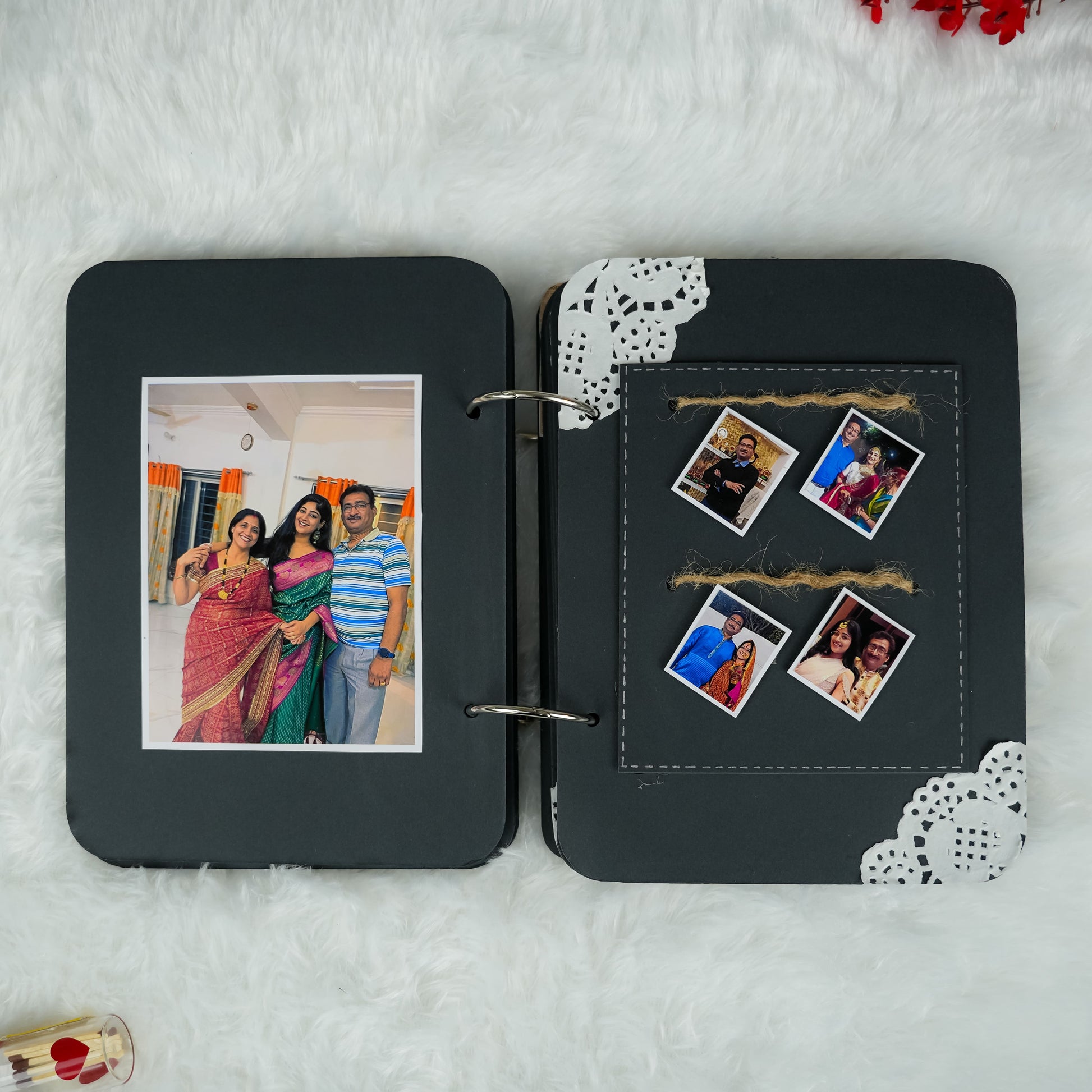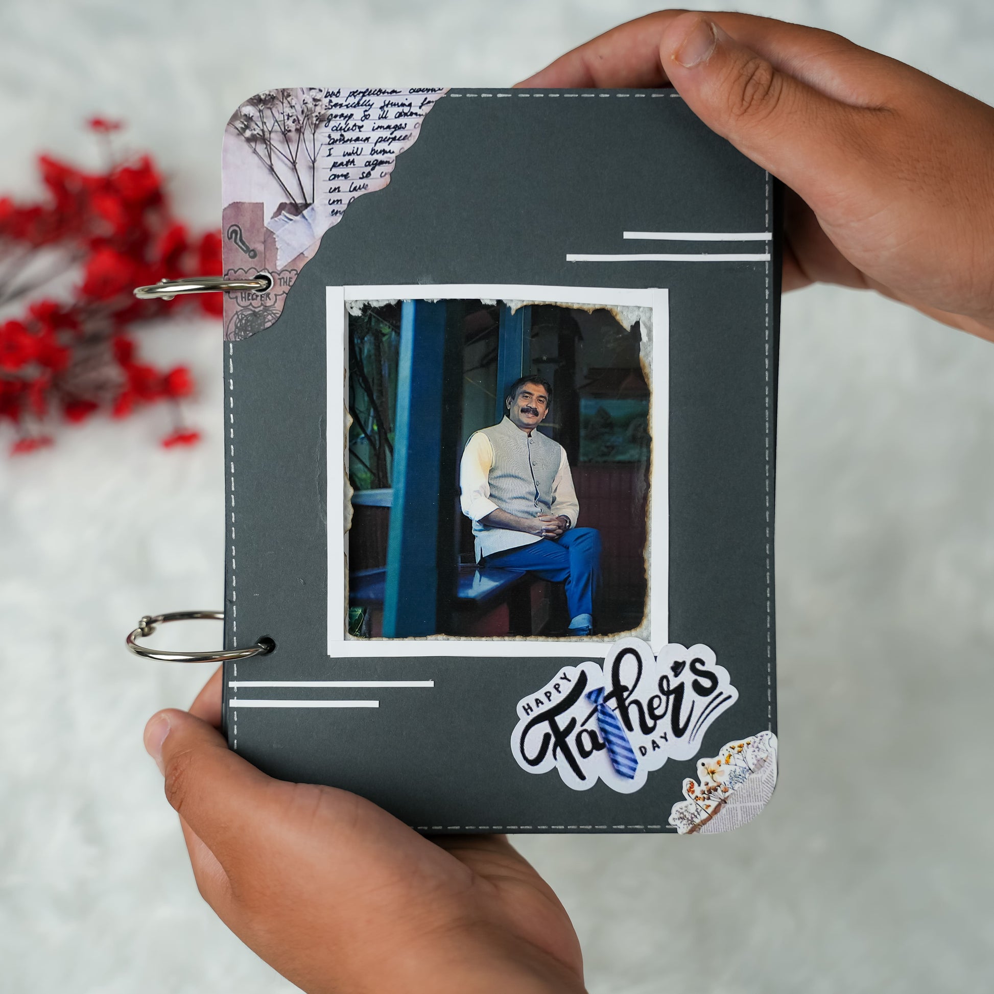 Surprise Dad this Father's Day with our magical "Fire Reveal" Album! This 8x6 inch album features a unique front page that, when lit, safely reveals a hidden image in a captivating glow. Inside, 12 thick black pages hold up to 35 personalized pictures and heartfelt messages. It has charming elements and matchsticks in a tiny bottle, it's an unforgettable and truly special gift for any dad.