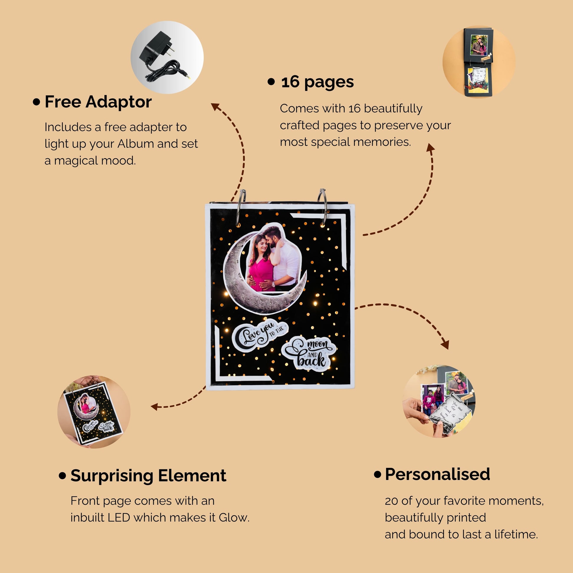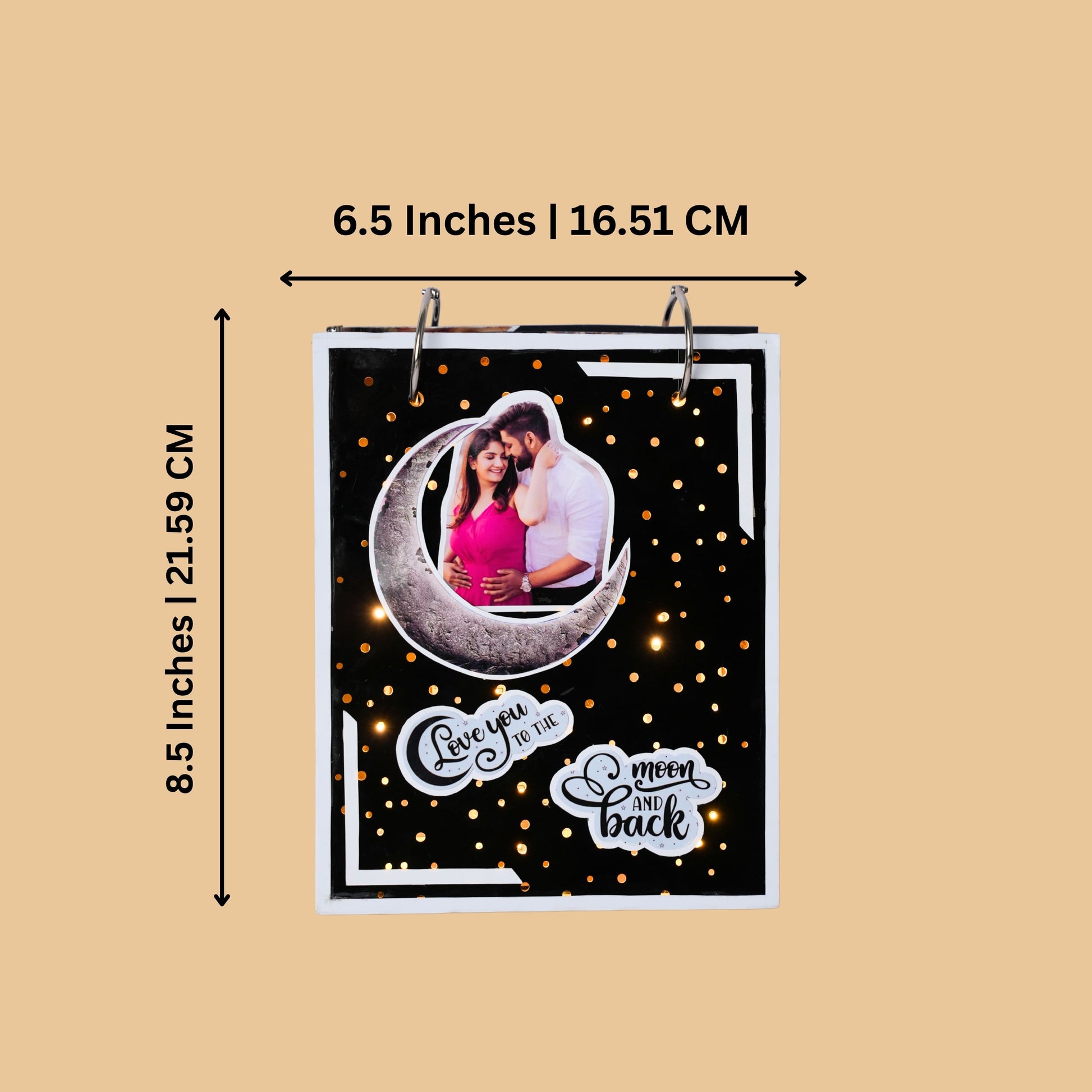 Declare your love "to the moon and back" with this captivating LED Light-Up Photo Album! Measuring 8.5x6.5 inches, this album is truly one-of-a-kind, featuring built-in LED lights on the front cover. When plugged in (using the free adapter we provide!), the cover transforms into a stunning starry night scene, illuminating a featured picture of you and your loved one. Inside, you'll find 16 unique pages designed with surprising elements, ready to hold 20 cherished photos. It's the perfect, glowing keepsake for an anniversary, birthday, or any special romantic occasion.
