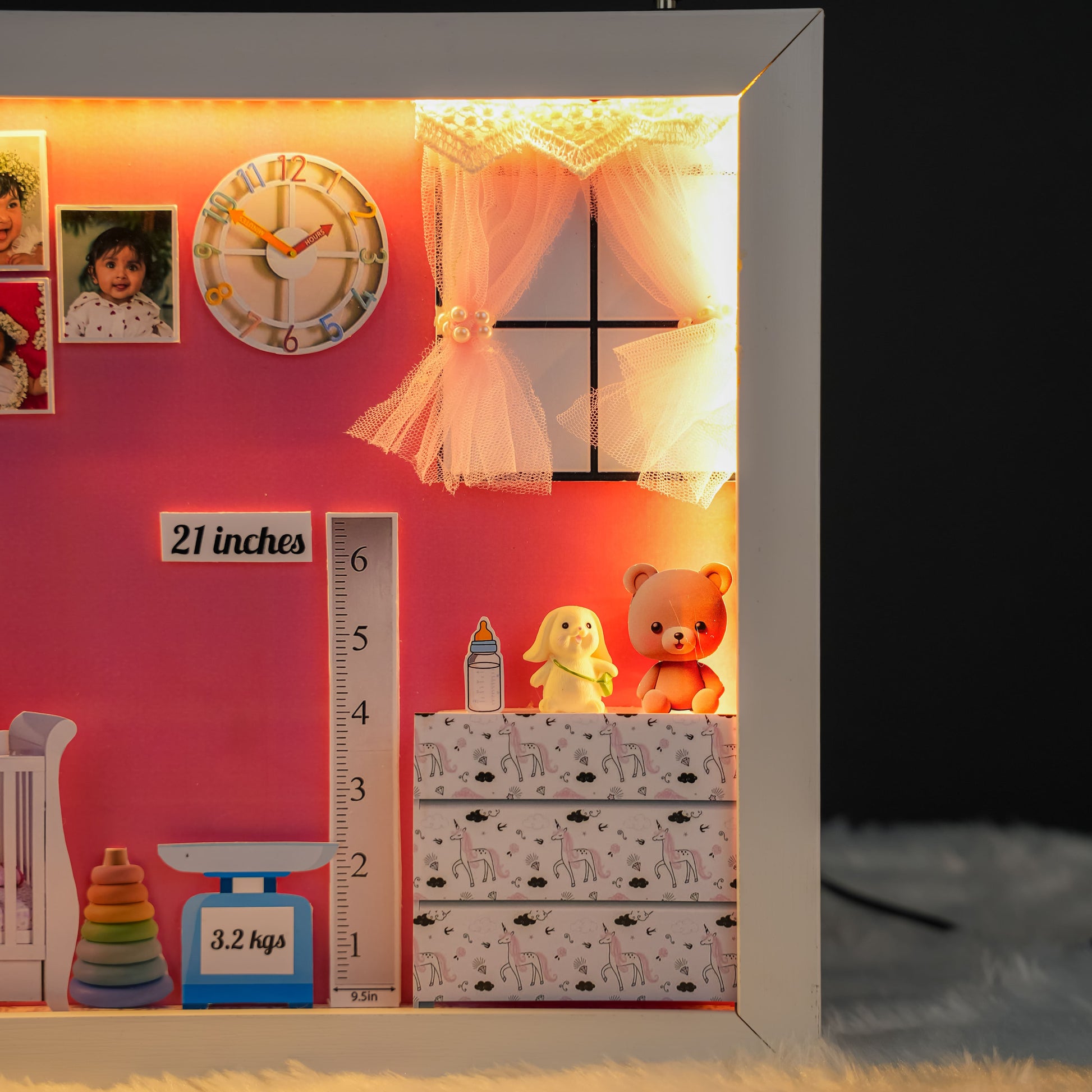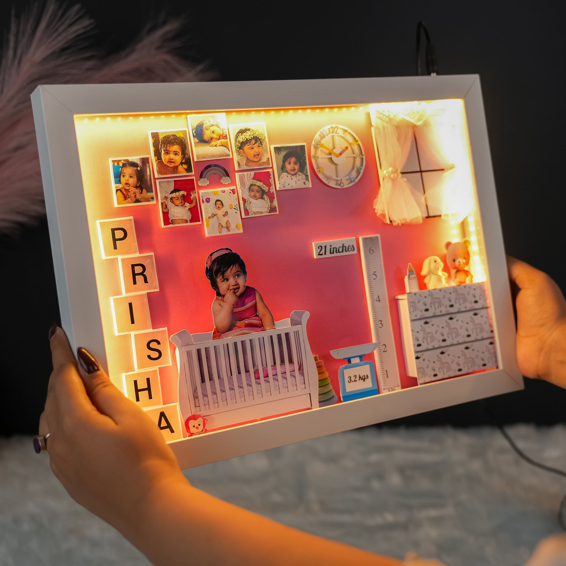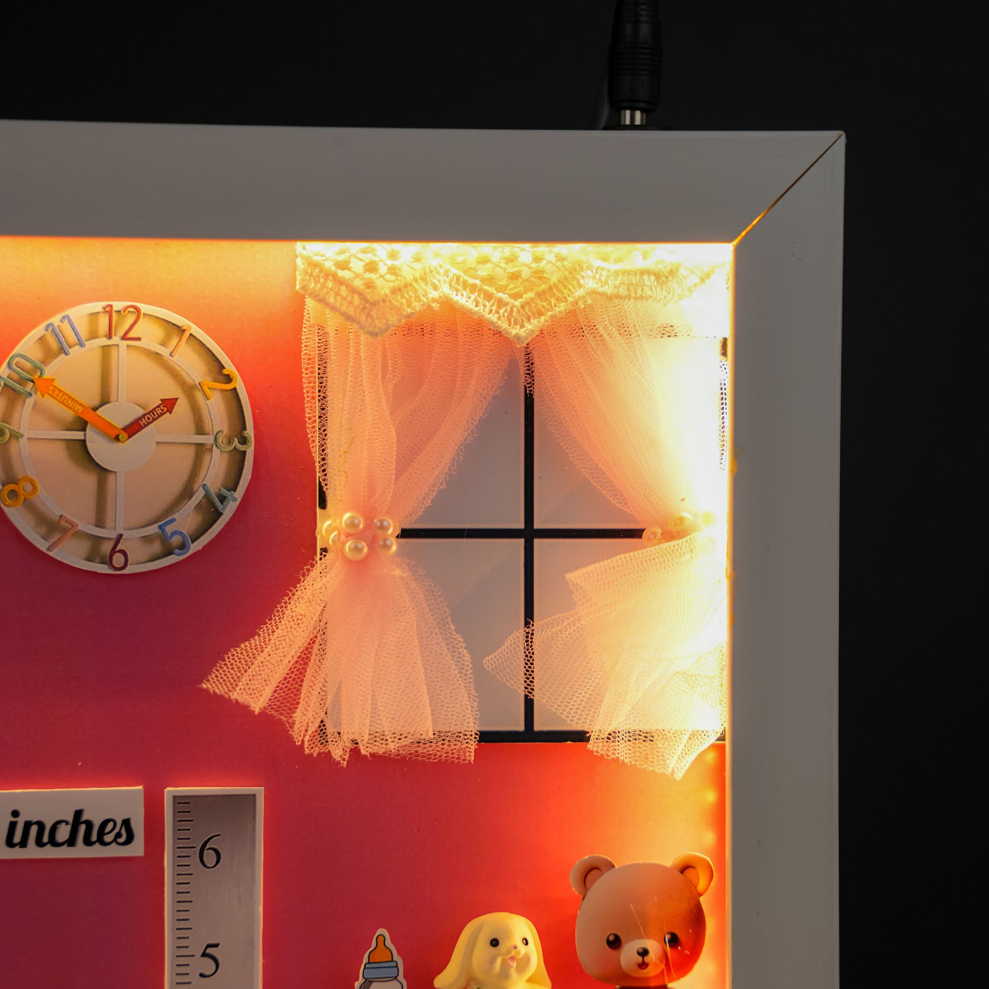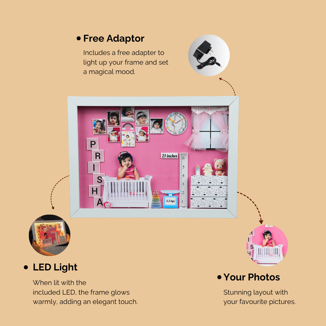 Celebrate a new arrival with our adorable LED Miniature Frame, perfect for new born babies! Available in 14.5x11 and 16.5x12.5 inches, this frame beautifully preserves your baby's pictures, name, height, and weight at birth. It features a charming miniature nursery scene with a cradle and tiny accessories, all illuminated by built-in LED lights (adapter included). A heartfelt keepsake for any new parent!