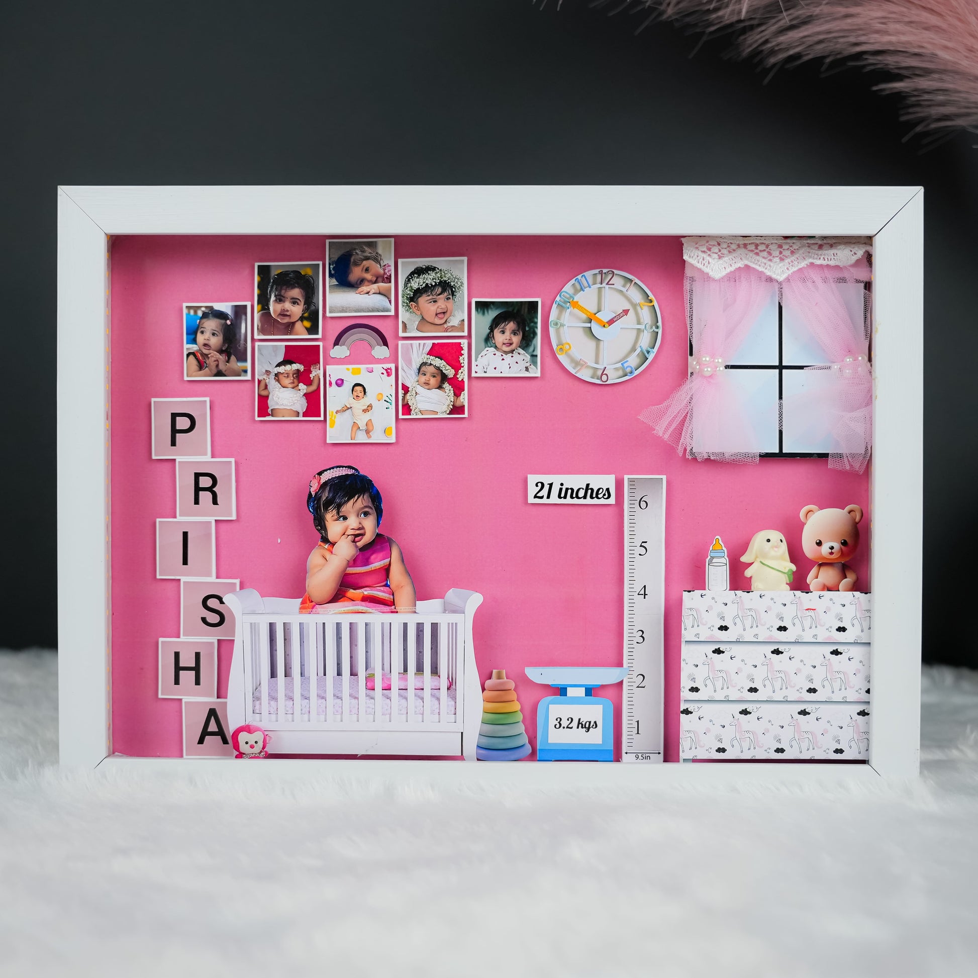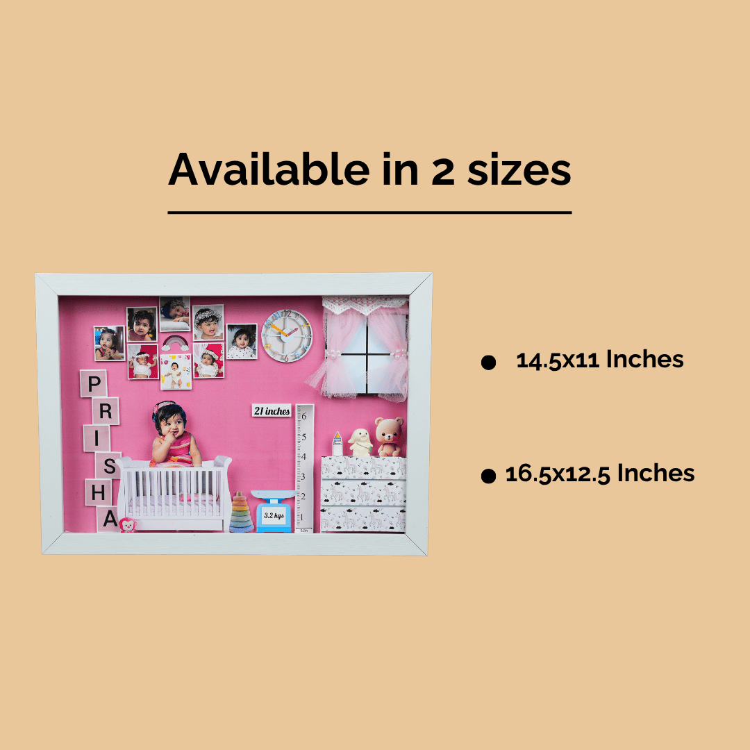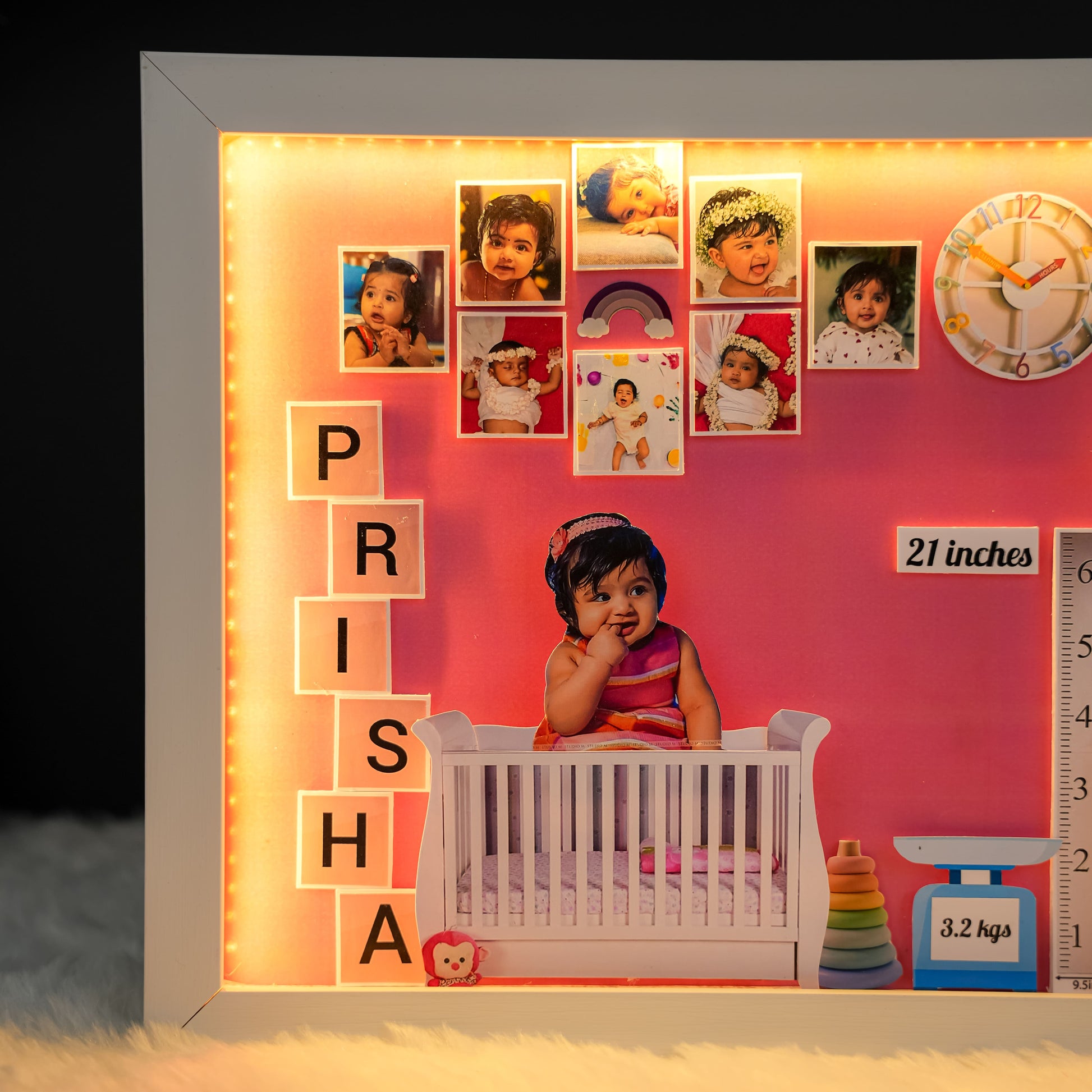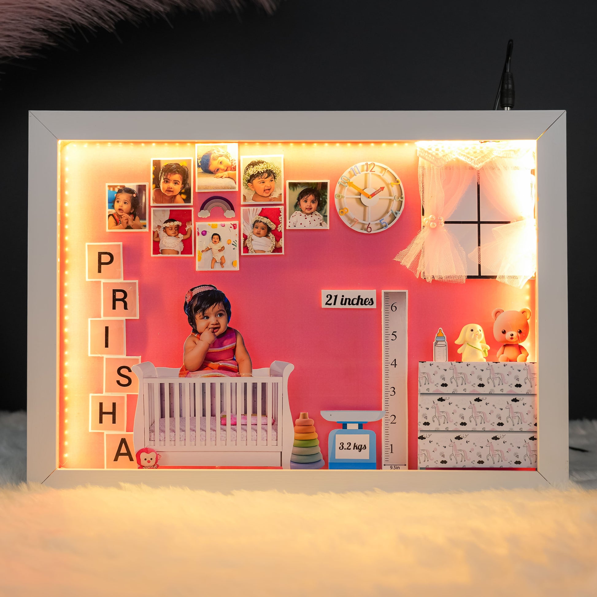 Celebrate a new arrival with our adorable LED Miniature Frame, perfect for new born babies! Available in 14.5x11 and 16.5x12.5 inches, this frame beautifully preserves your baby's pictures, name, height, and weight at birth. It features a charming miniature nursery scene with a cradle and tiny accessories, all illuminated by built-in LED lights (adapter included). A heartfelt keepsake for any new parent!