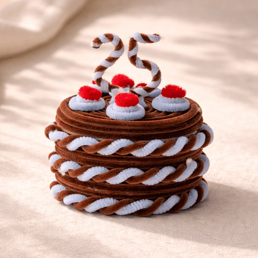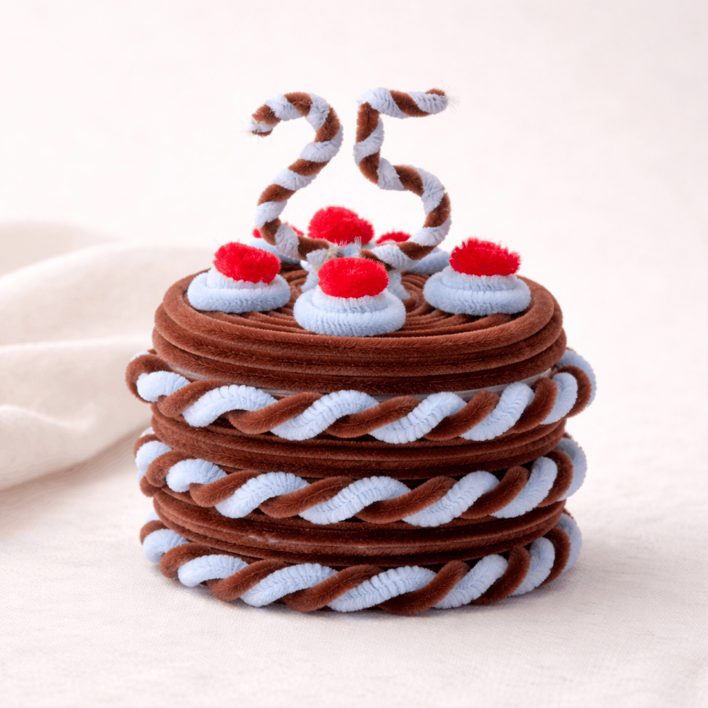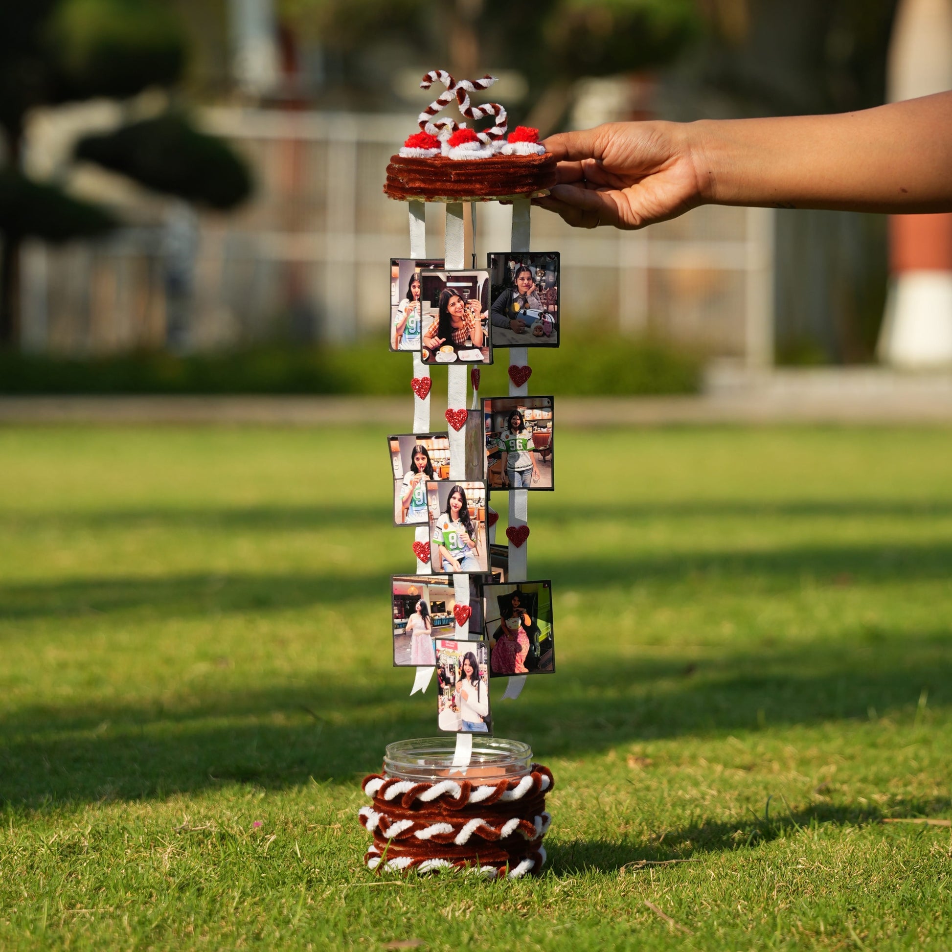 A unique handmade openable cake crafted with fuzzy sticks, featuring a customizable age topper and a surprise inside with 24 hanging photo memories—perfect for personalized gifting.