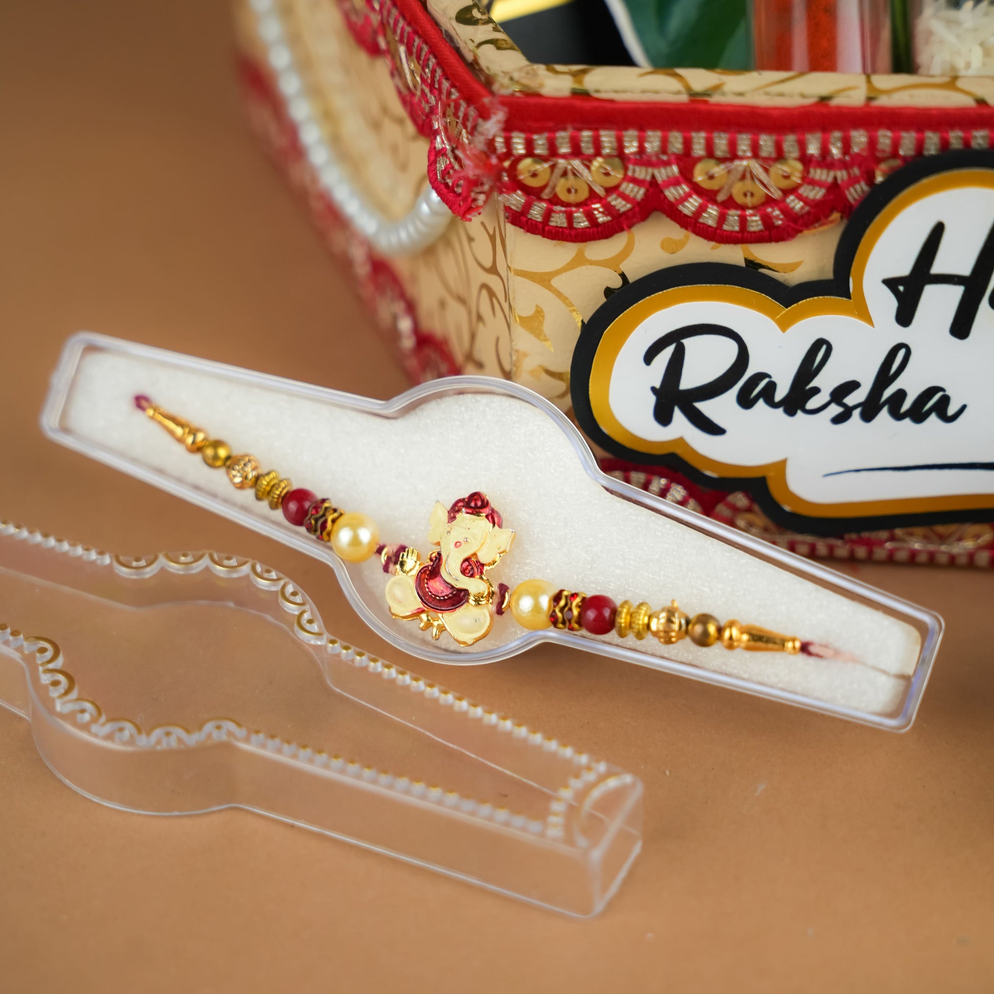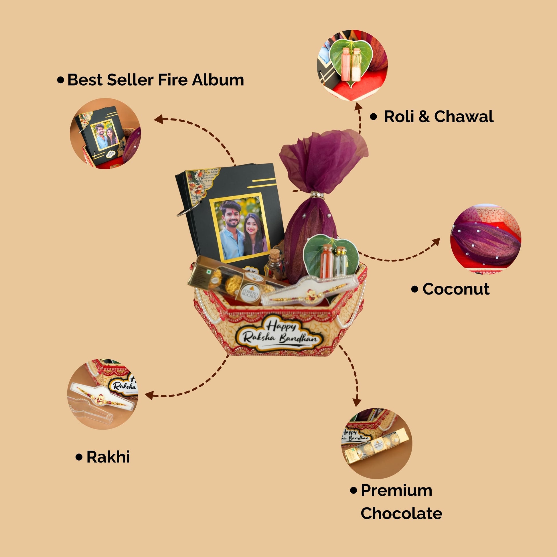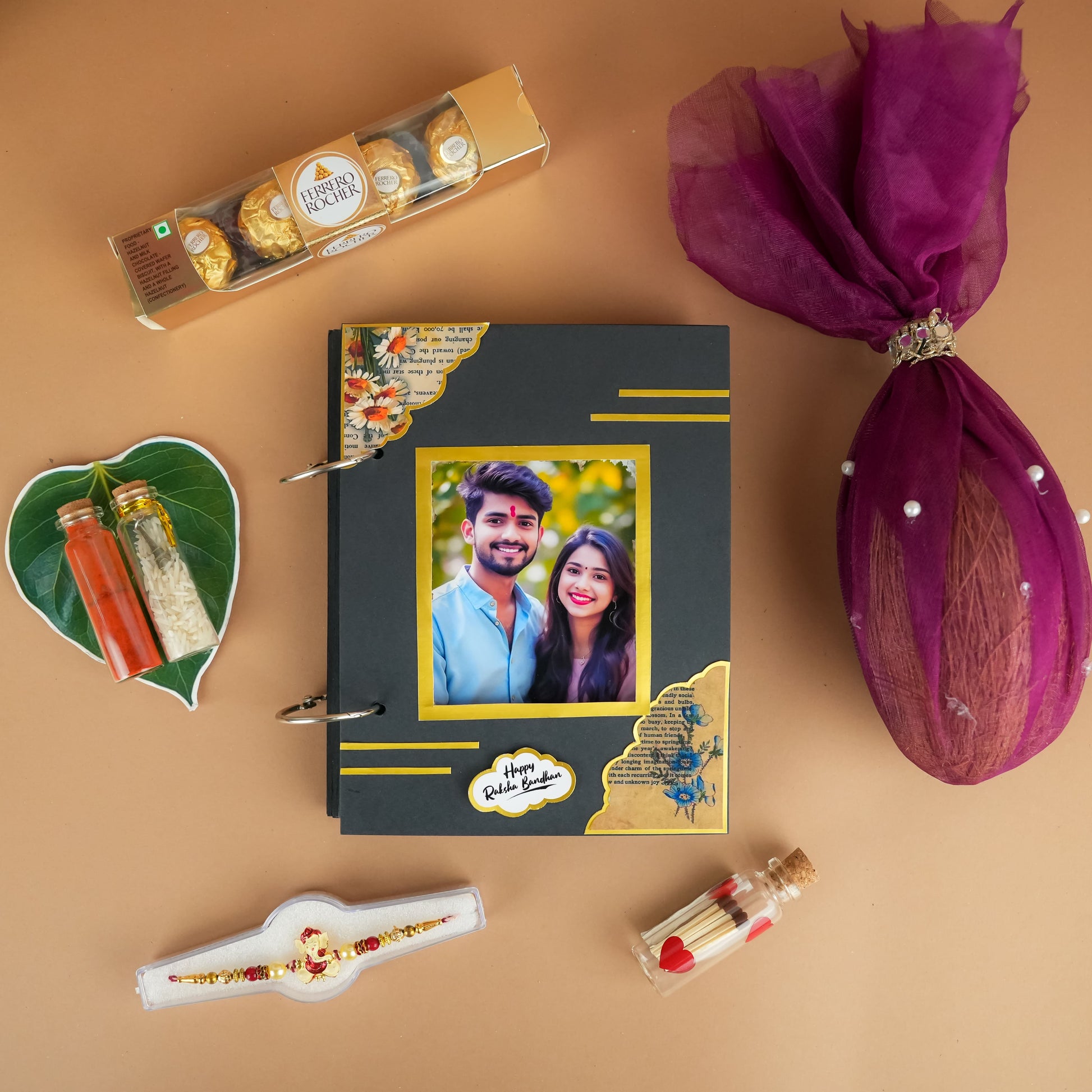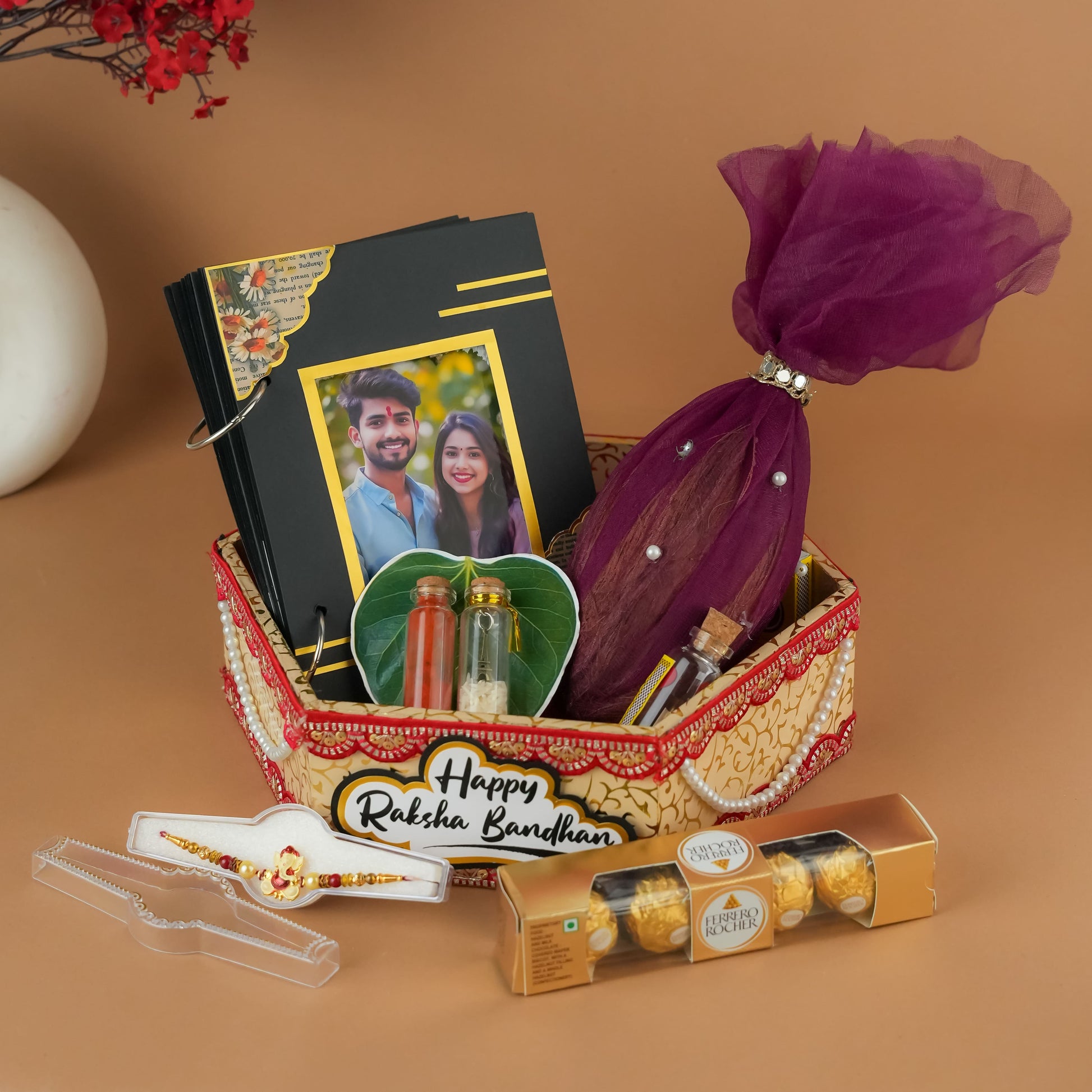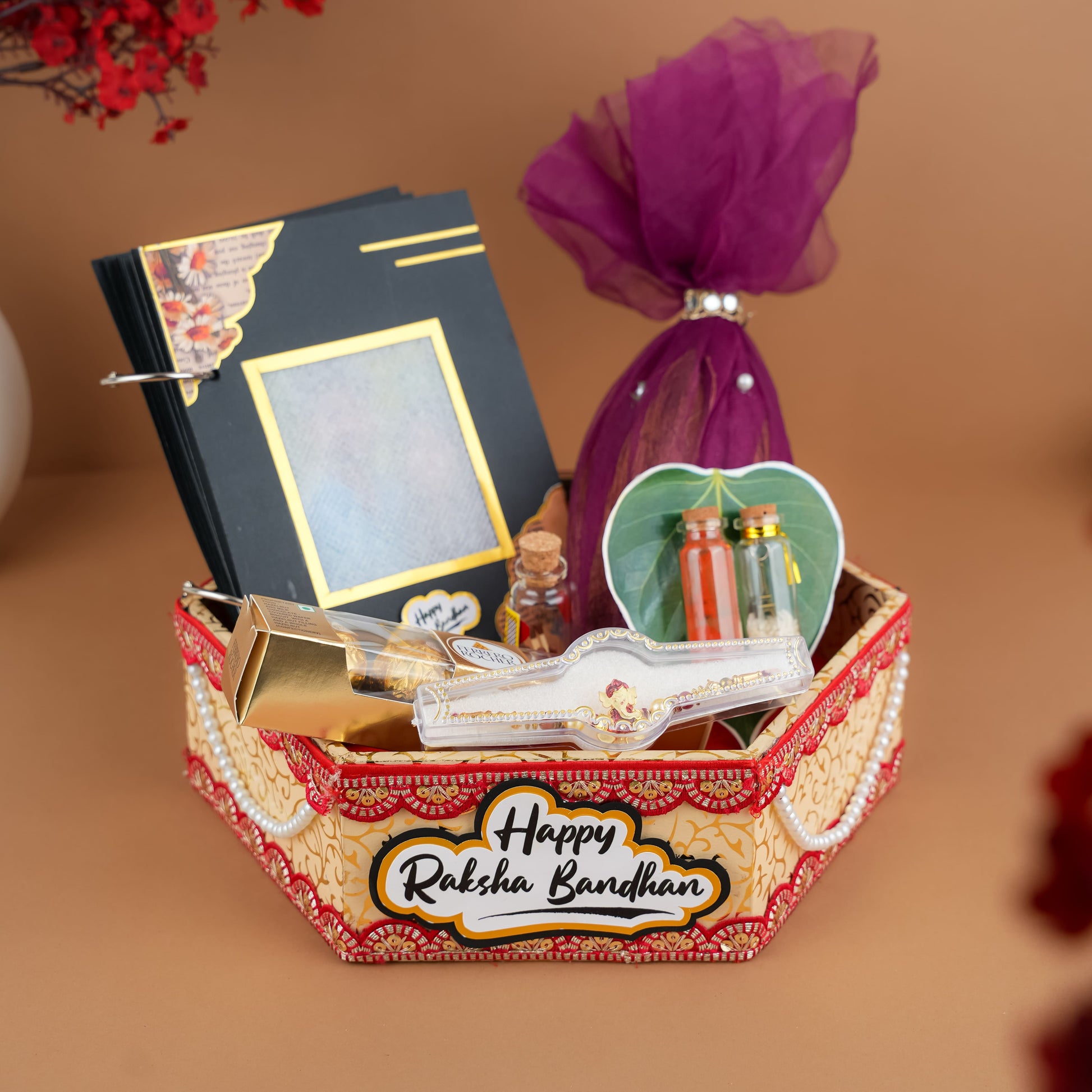 Celebrate the eternal bond of Raksha Bandhan with our exquisite Ultimate Raksha Bandhan Celebration Hamper. This beautifully curated hamper, presented in a unique hexagonal MDF basket (12x10 inches), is designed to bring joy, tradition, and a touch of magic to your sibling's day. Each of the five thoughtfully selected items embodies the spirit of this cherished festival, making it the perfect gift to express your love and blessings.