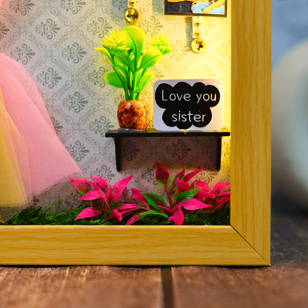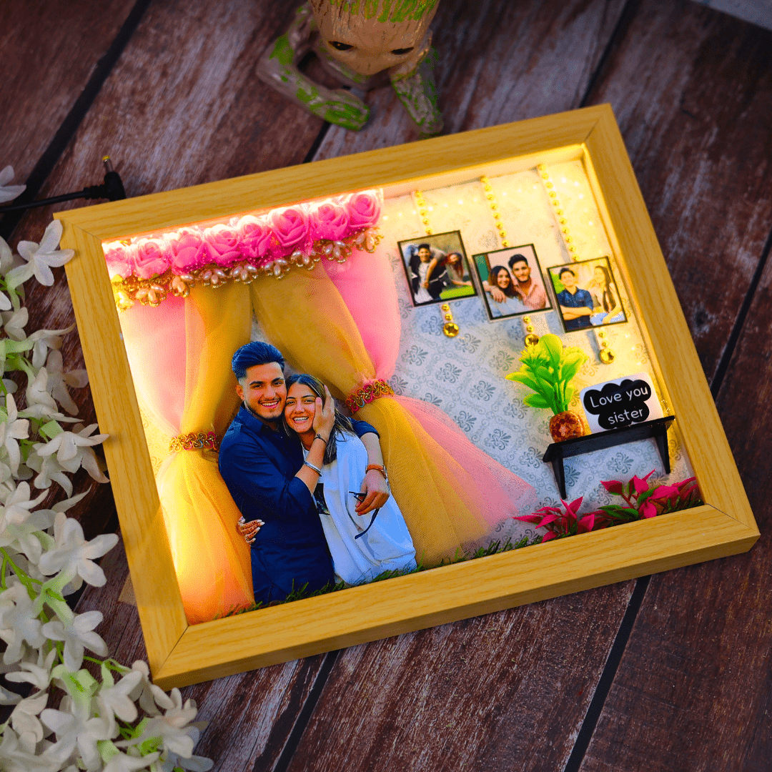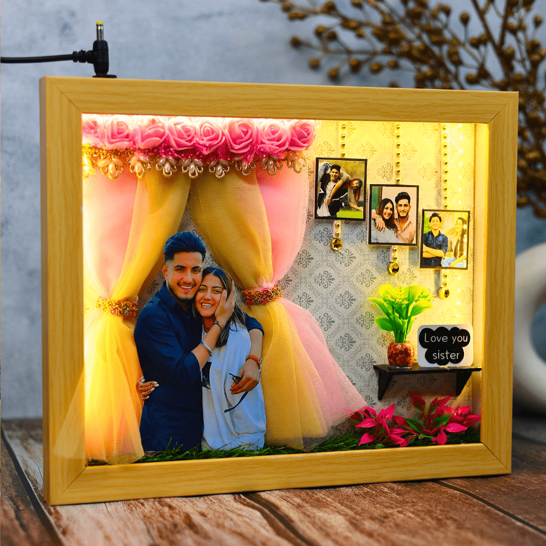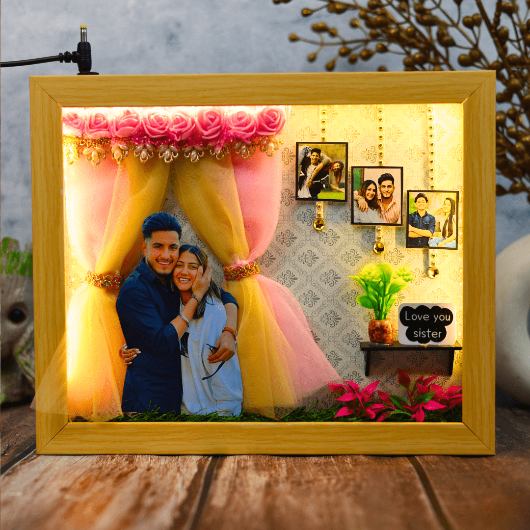 This Raksha Bandhan, give the gift of cherished memories that truly shine with our Sibling Spotlight Personalized Miniature Frame. Designed to celebrate the unique bond between siblings, this frame features a built-in LED light system that beautifully highlights your precious moments, making it a heartfelt and luminous tribute to your relationship.