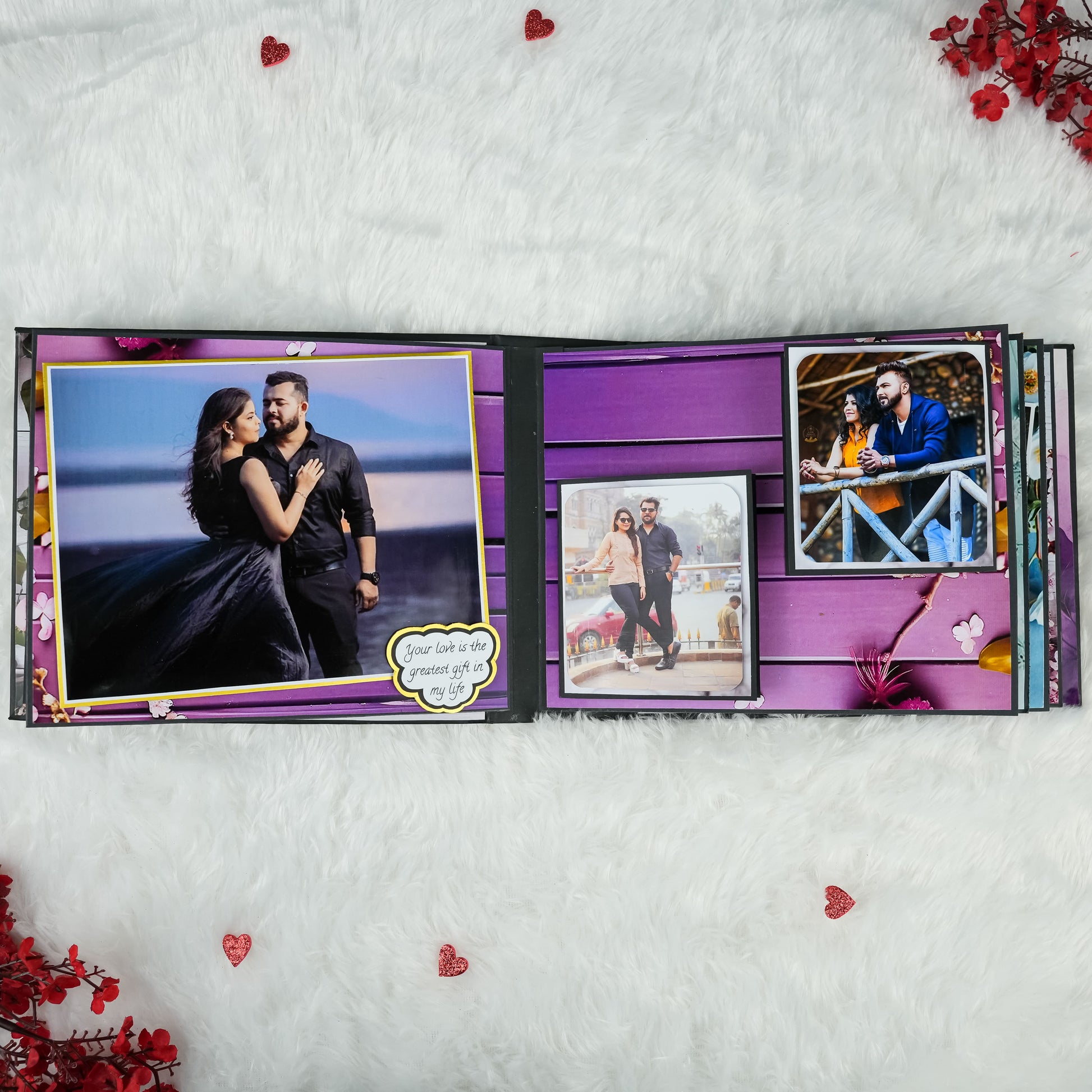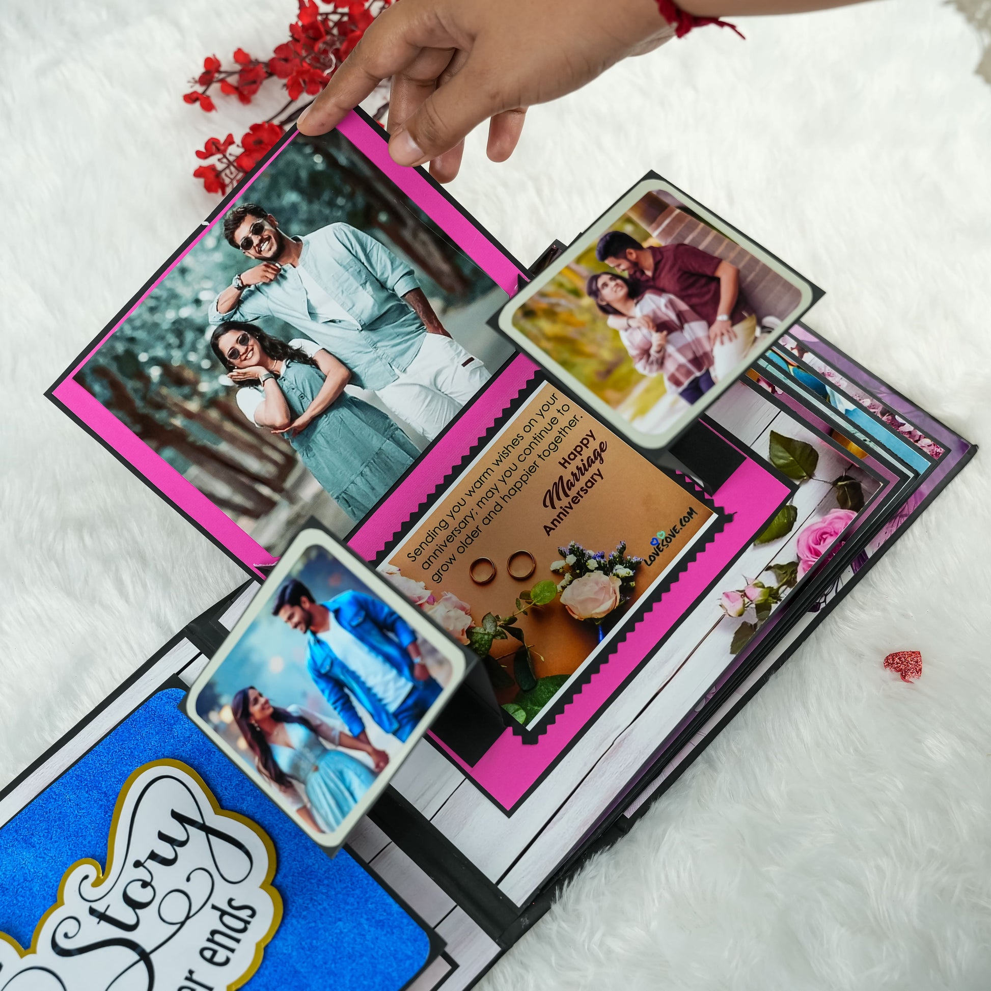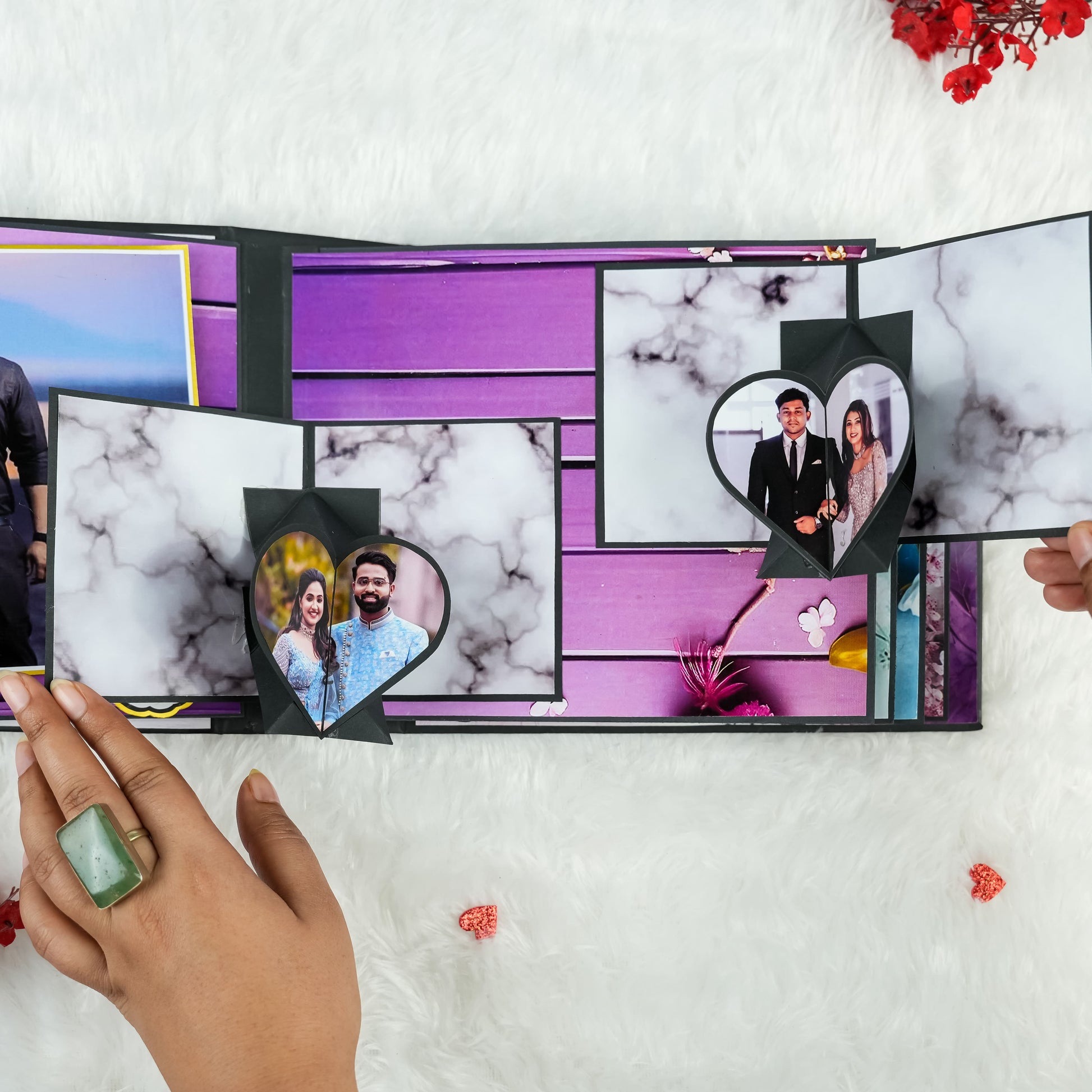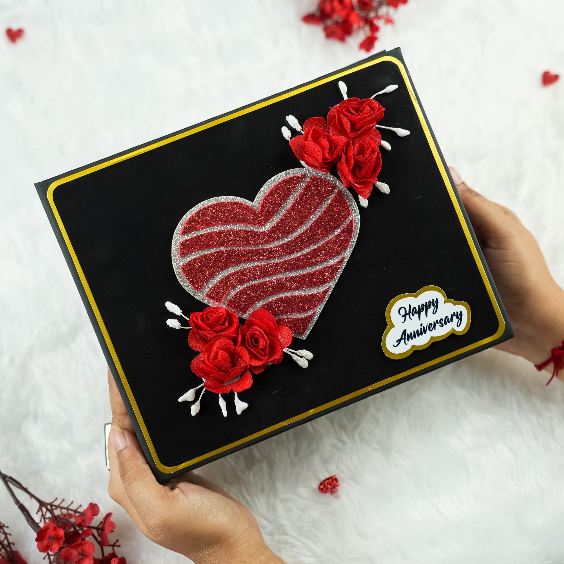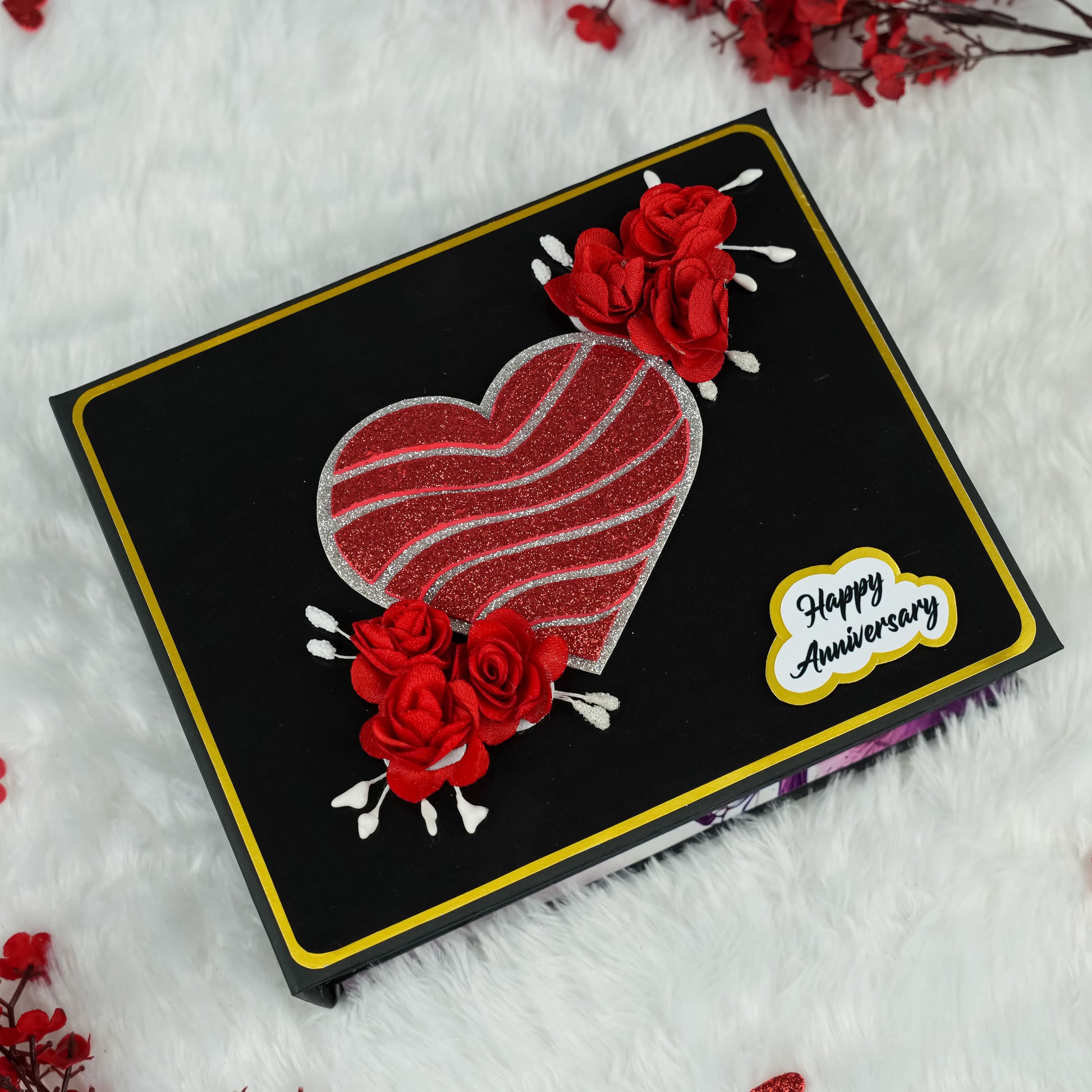 Celebrate your enduring love with our beautifully crafted Anniversary Photo Album! Measuring 22x18 cm, this album features 5 exquisitely designed pages filled with delightful "wow" elements to perfectly enhance your cherished memories. It offers ample space to capture your precious moments, holding 30 to 45 photographs. The album's cover is a true work of art, adorned with striking silver and red glitter hearts complemented by elegant red roses, making it a unique and romantic gift to honor your special anniversary.