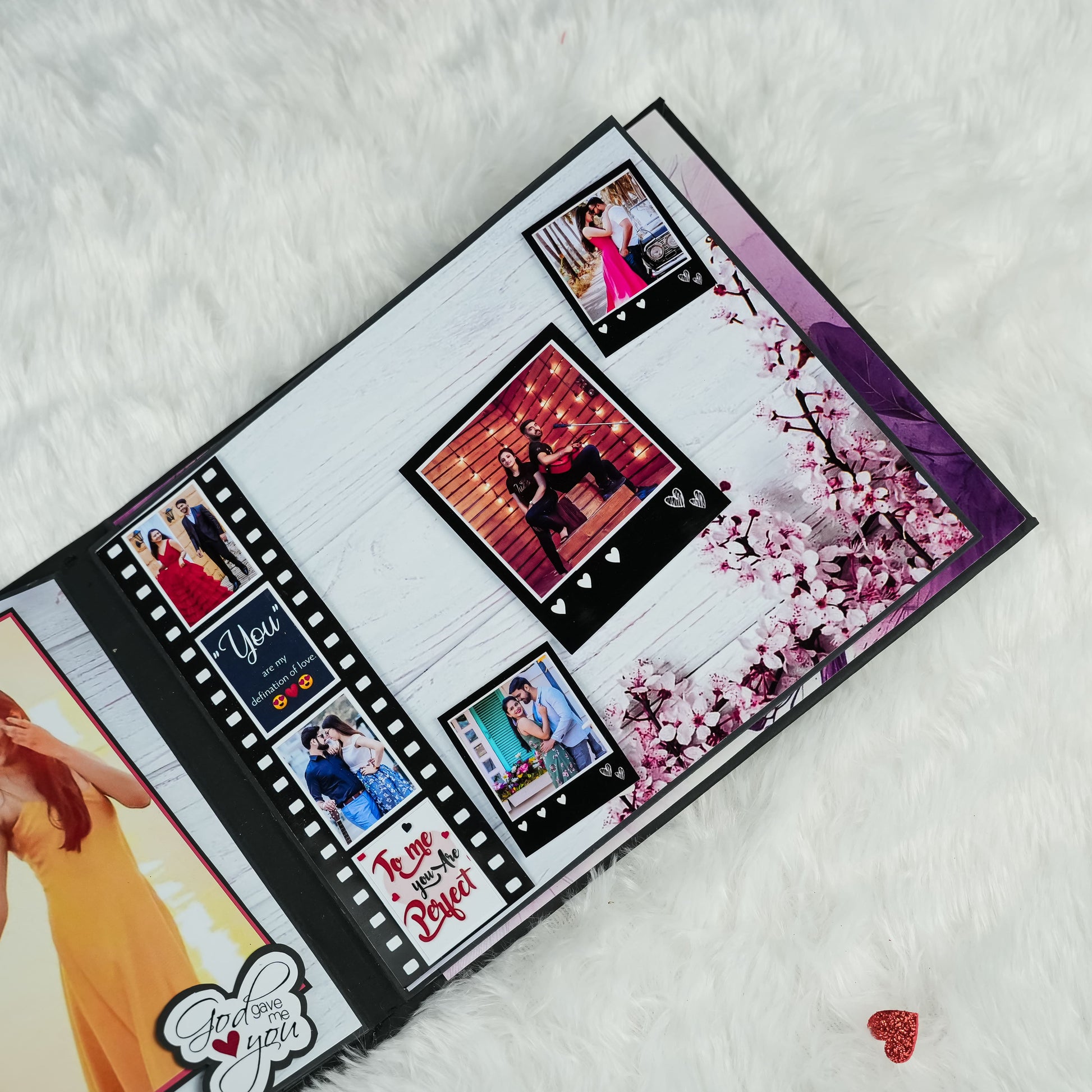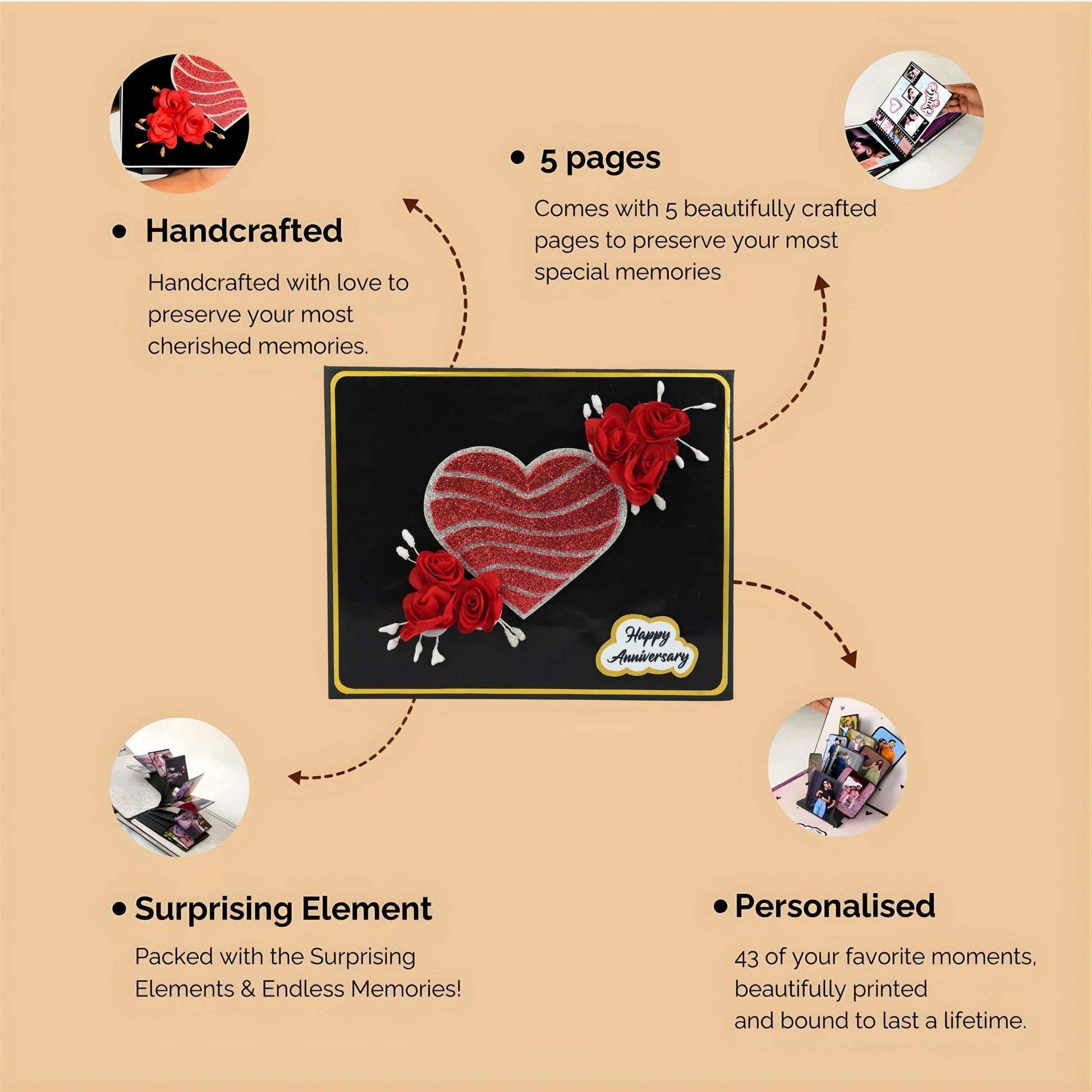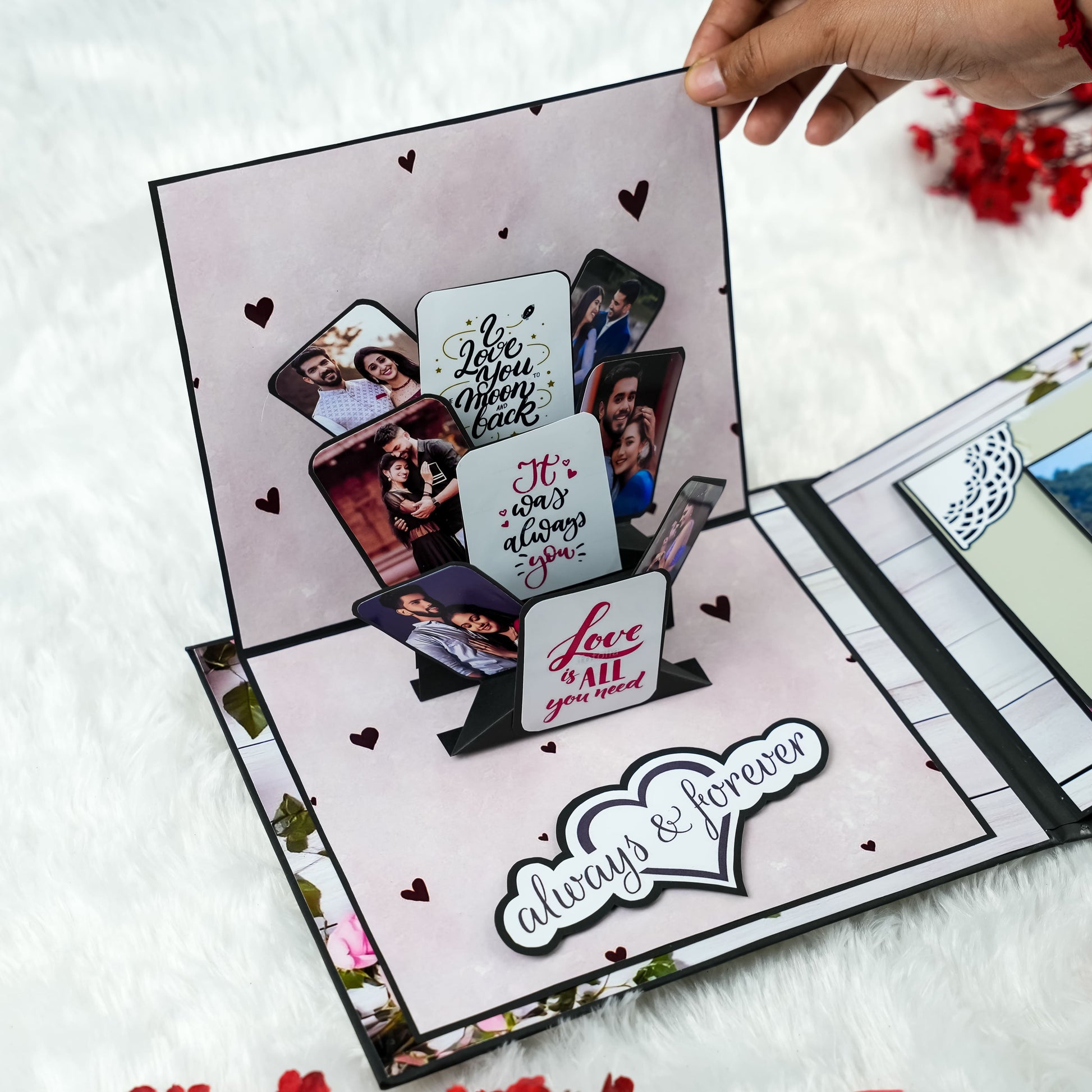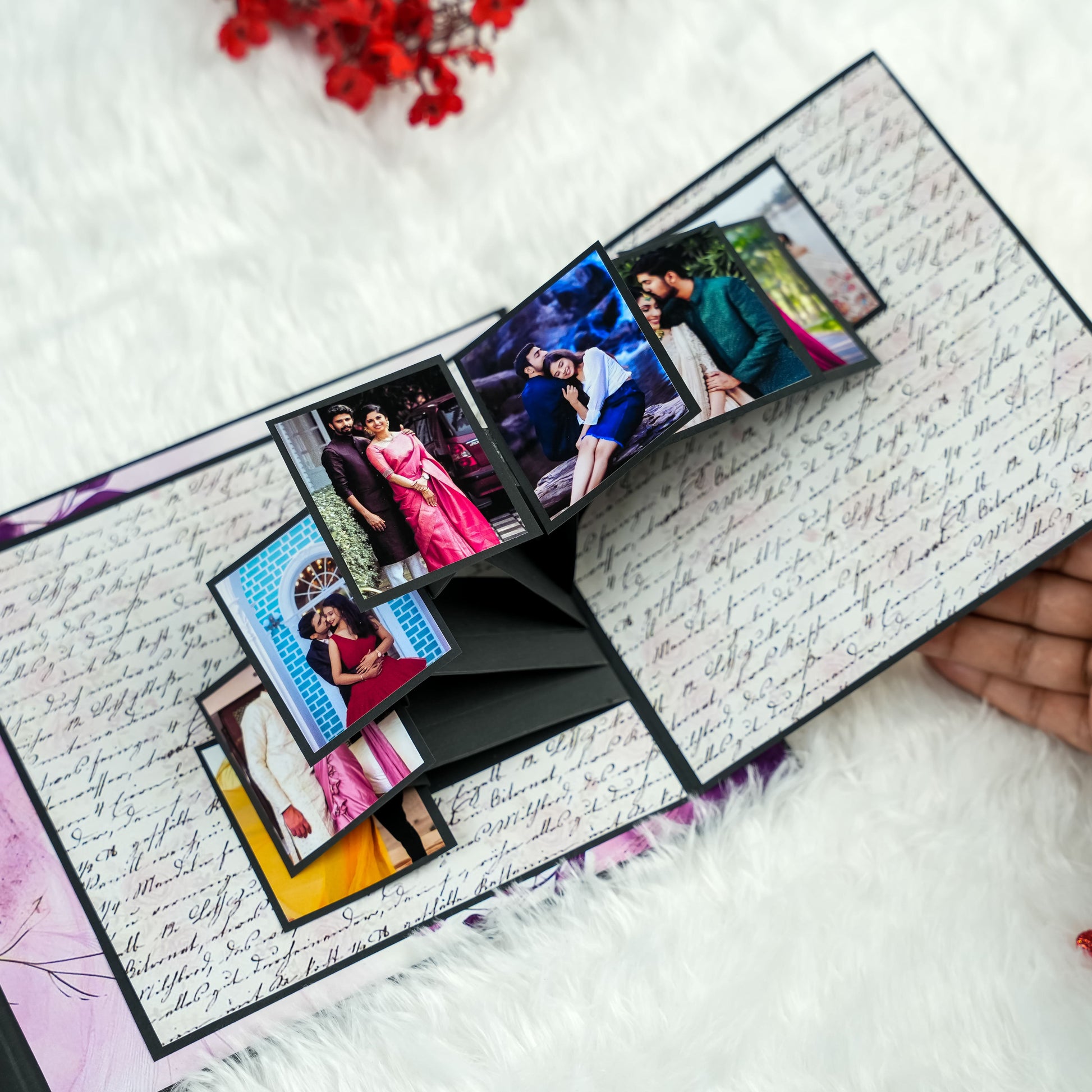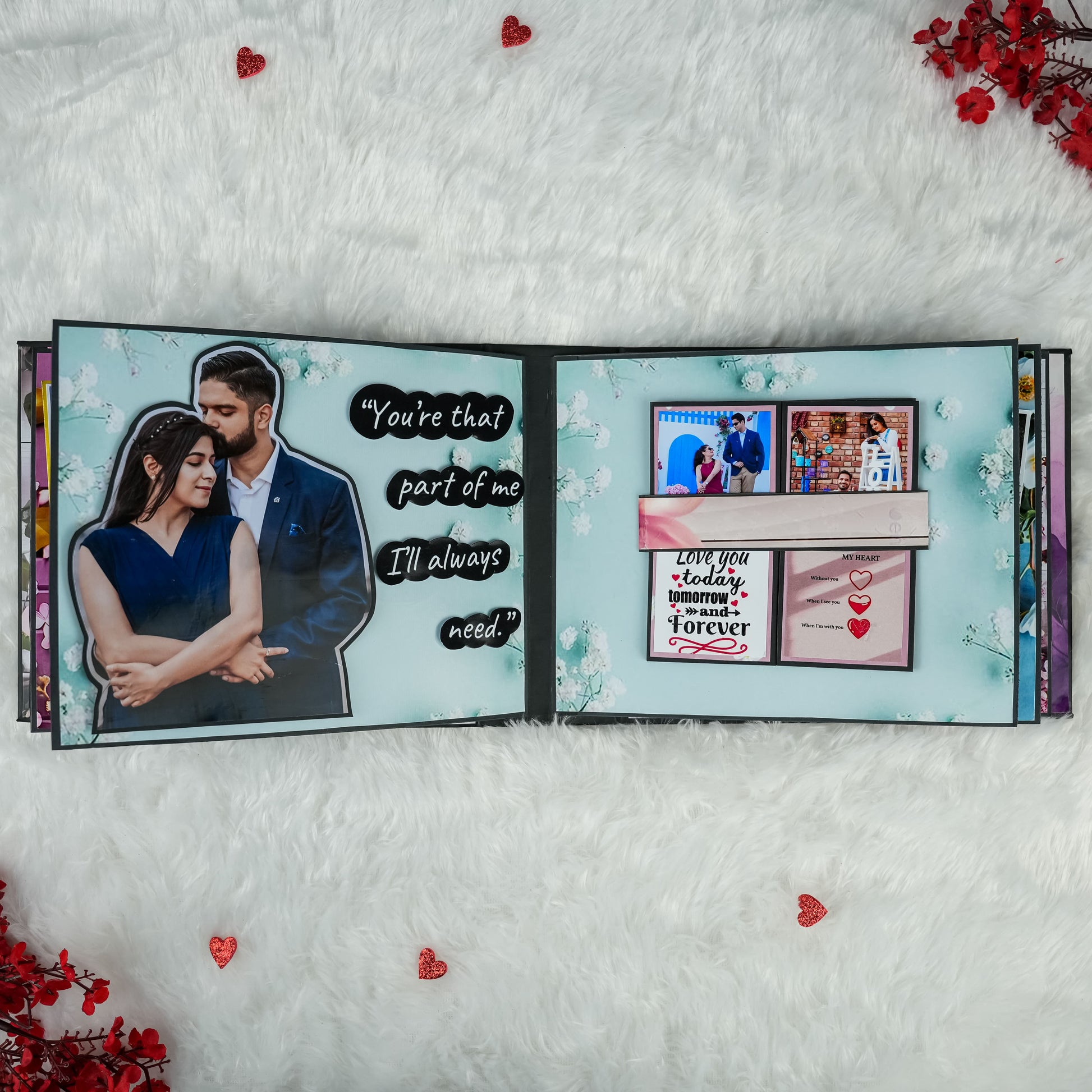 Celebrate your enduring love with our beautifully crafted Anniversary Photo Album! Measuring 22x18 cm, this album features 5 exquisitely designed pages filled with delightful "wow" elements to perfectly enhance your cherished memories. It offers ample space to capture your precious moments, holding 30 to 45 photographs. The album's cover is a true work of art, adorned with striking silver and red glitter hearts complemented by elegant red roses, making it a unique and romantic gift to honor your special anniversary.